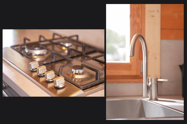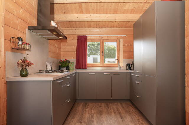 De open keuken is modern en compleet uitgerust. Slim ingedeeld, met onder andere een gaskookplaat, voldoende kastruimte, vaatwasser en koelkast. Compact, maar alles wat je nodig hebt is aanwezig zodat koken tijdens een weekend weg net zo gemakkelijk gaat als thuis.