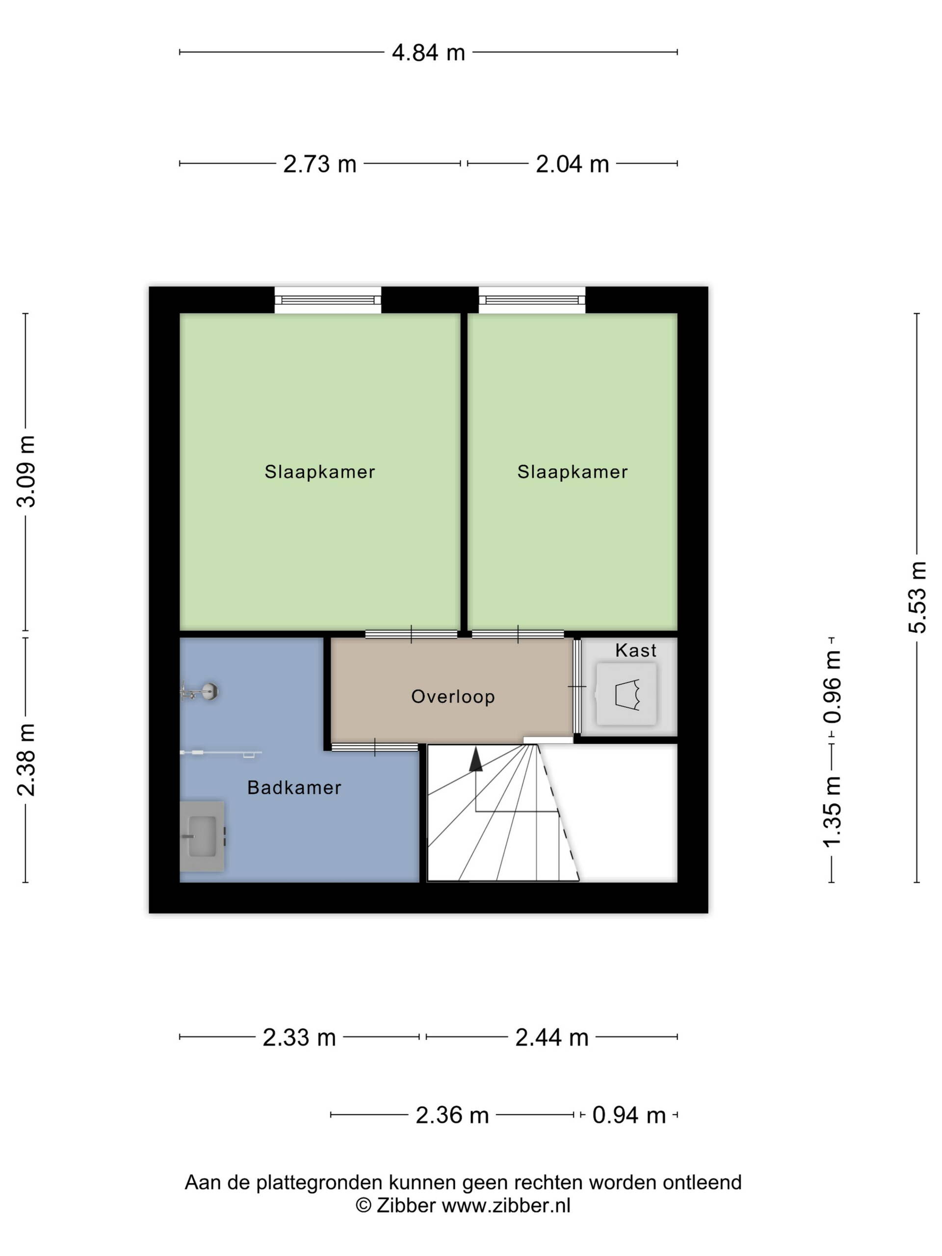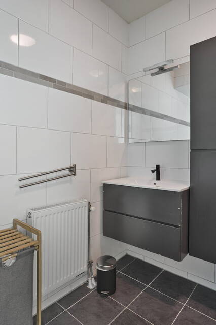 De overloop geeft toegang tot twee slaapkamers en de moderne badkamer, uitgerust met een inloopdouche, en wastafel. Op de overloop bevindt zich tevens een praktische vaste kast met de opstelplaats voor de wasmachine.