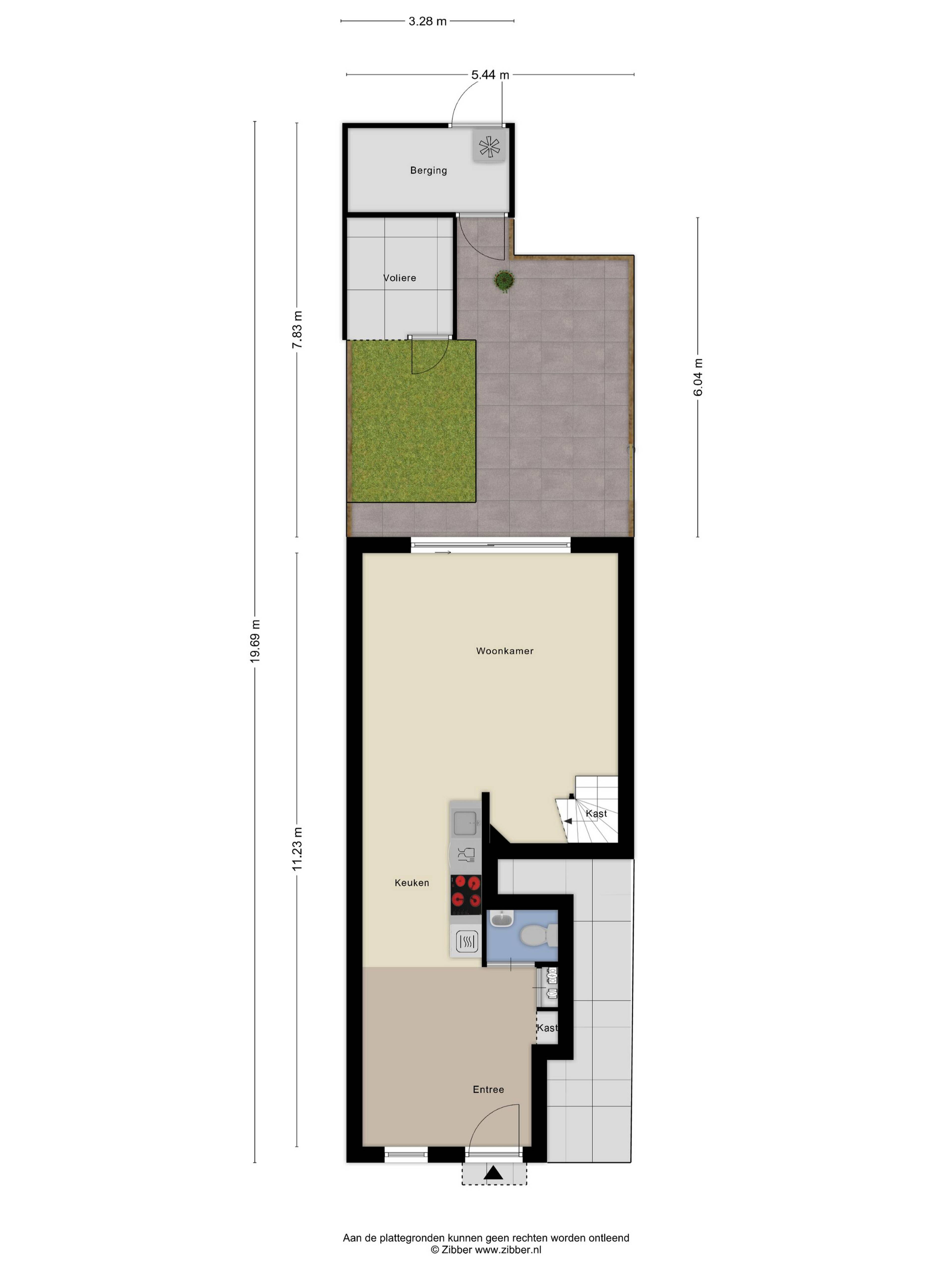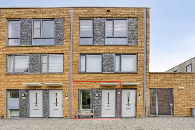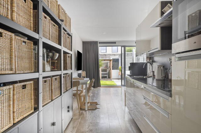 De entree bevindt zich aan de zijkant van de woning. Je komt binnen in de eetkamer met een moderne open keuken, voorzien van complete inbouwapparatuur: koel-vriescombinatie, inductiekookplaat, afzuigkap, vaatwasser en combimagnetron. De lichte woonkamer heeft een grote schuifpui en een extra zijraam, waardoor er veel daglicht binnenvalt.