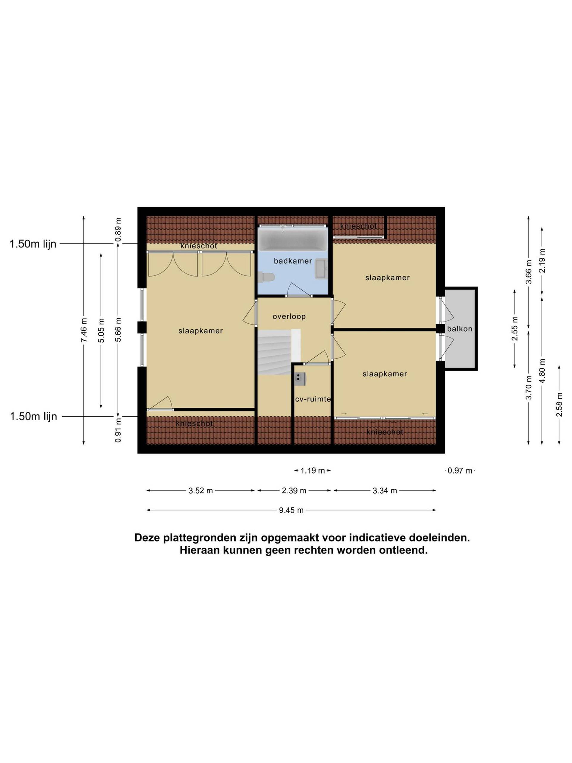 De overloop op de eerste verdieping geeft toegang tot 3 slaapkamers, de badkamer en de CV-ruimte. Alle slaapkamers hebben een nette laminaatvloer en handige inbouwkasten. In elke kamer is daarnaast ook plek voor een bed en tafel. De twee kleinere kamers geven toegang tot een balkon.