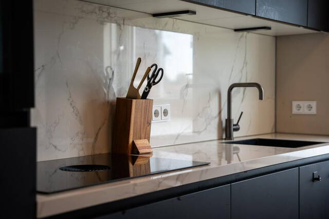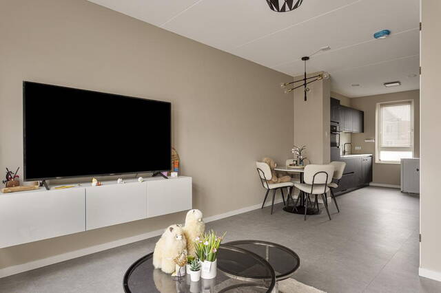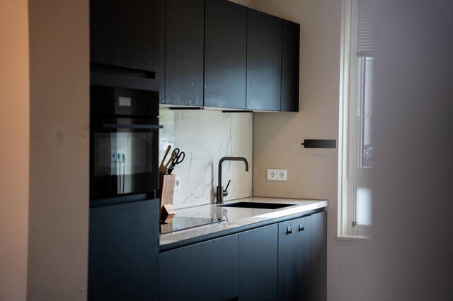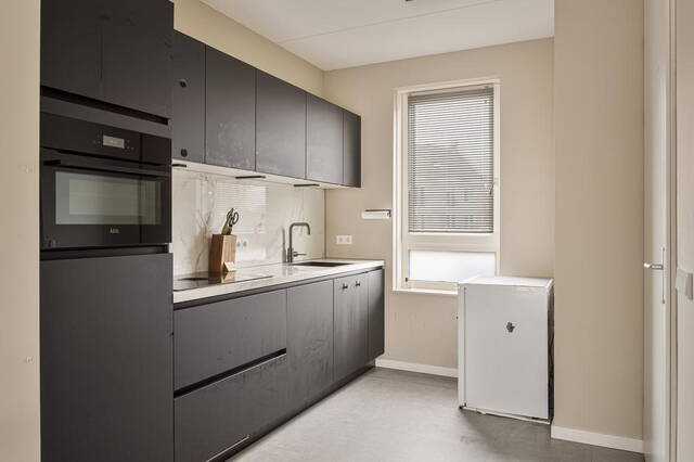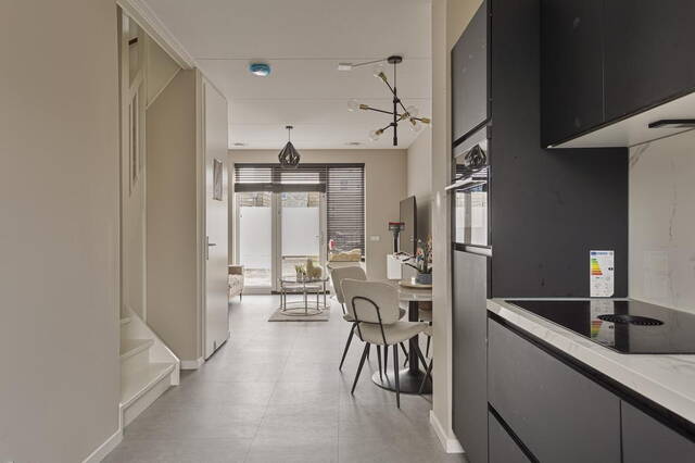 Aangrenzend aan de woonkamer bevindt zich de open keuken. Deze moderne keuken is voorzien van een donker keukenmeubel en een licht composiet werkblad. De keuken is uitgerust met hoogwaardige apparatuur zoals een inductiekookplaat met geïntegreerde afzuiging, een combi-oven, een koelkast en een vaatwasser. Het raam in de keuken zorgt voor voldoende daglicht tijdens het koken.