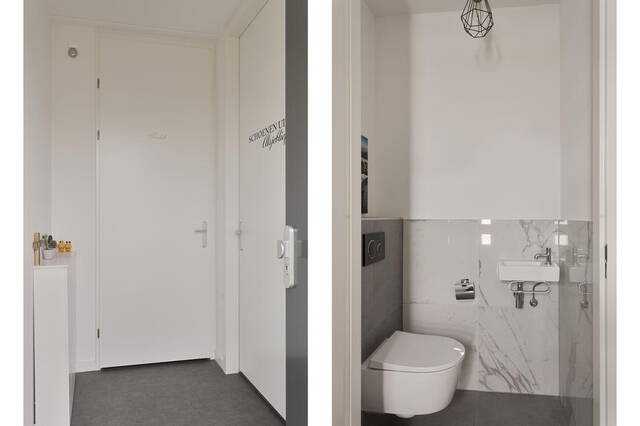 Bij binnenkomst in de hal valt direct de moderne afwerking op. De lichte wanden en de pvc-vloer lopen strak door richting de woonkamer. Hier vind je ook de meterkast en het moderne toilet. Vanuit de hal kom je in de ruime en lichte woonkamer, waar een plafondhoge raampartij met tuindeur zorgt voor een prettige lichtinval. De ruimte biedt meer dan genoeg plek voor een sfeervolle zithoek en een eettafel. De trapkast biedt handige opbergruimte voor voorraad en andere spullen, en via de trap in de woonkamer bereik je de eerste verdieping.