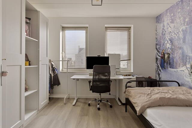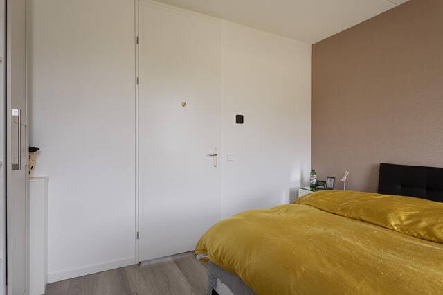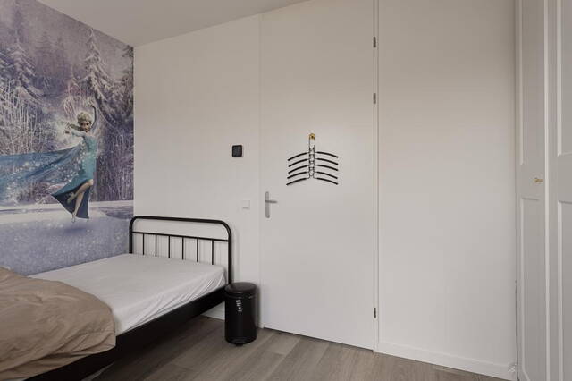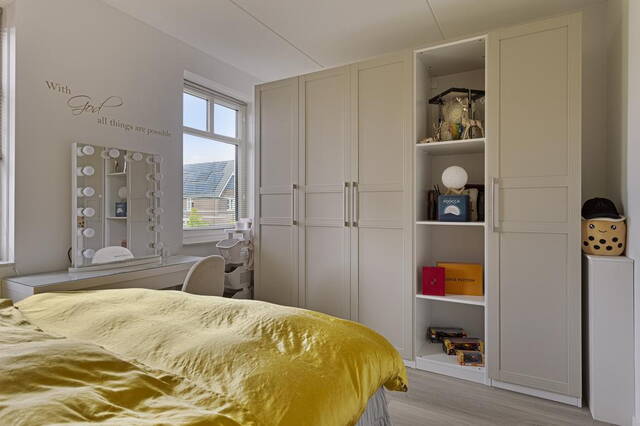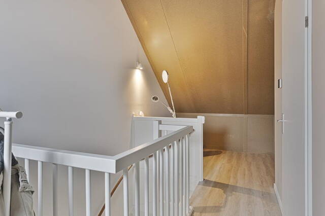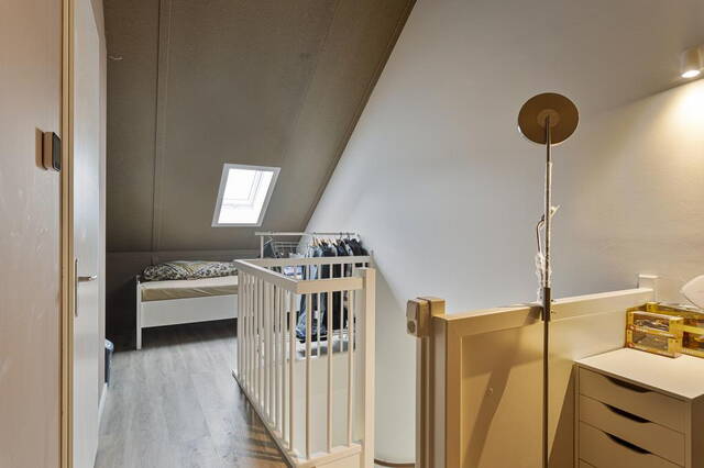 Via een vaste trap bereik je de tweede verdieping. Hier bevindt zich de derde slaapkamer, die opvalt door zijn speelse en ruime indeling. Een dakraam zorgt voor een prettige hoeveelheid daglicht. Op deze verdieping vind je ook de praktische berging met warmtepomp-installatie en aansluitingen voor wasmachine en droger.