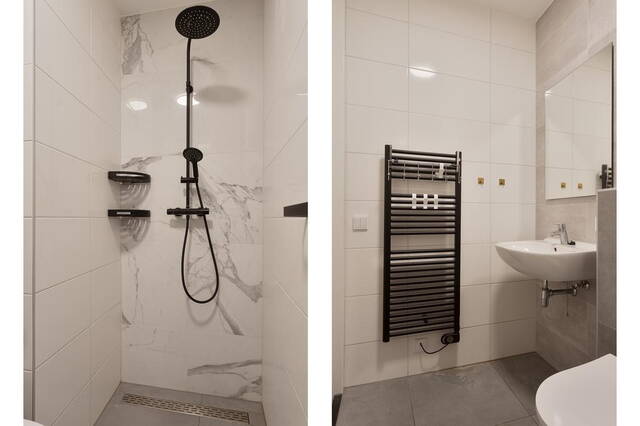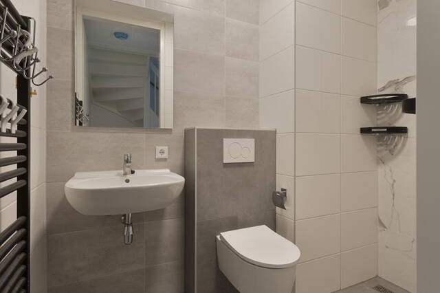 Op de eerste verdieping bevindt zich een overloop met strekkende pvc-vloer, die leidt naar twee ruime slaapkamers. Beide slaapkamers, één aan de voorzijde en één aan de achterzijde, zijn even groot en hebben een keurige afwerking. De dubbele ramen zorgen voor een fijne lichtinval, wat de kamers nog ruimer doet aanvoelen. De moderne badkamer is voorzien van strak tegelwerk en beschikt over een comfortabele regendouche, een wastafel en een hangend toilet. Een elektrische designradiator maakt deze badkamer helemaal af, zodat je er heerlijk warm bij staat in de koudere maanden.