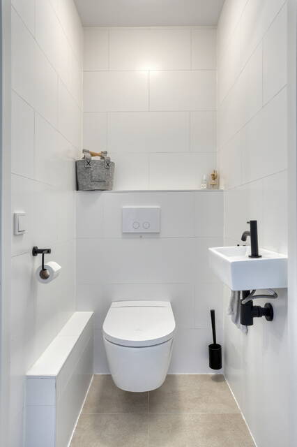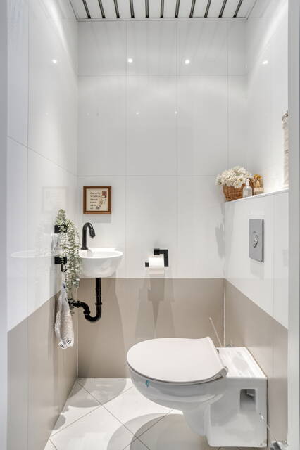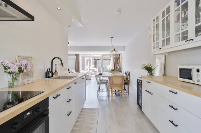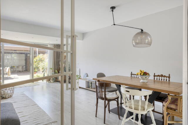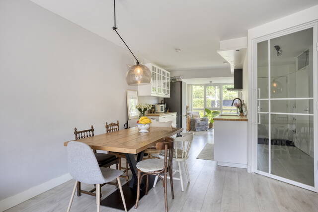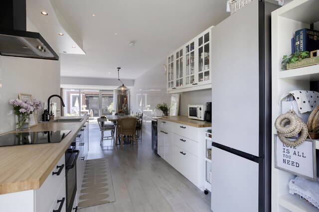 Entrance via a hallway with a toilet. The living room is bright and spacious, thanks to the rear extension, and opens directly onto the garden. The open-plan kitchen (2023) is equipped with modern built-in appliances and finished in a timeless, neutral style – perfect for everyday cooking or entertaining.