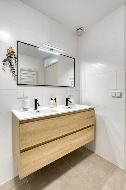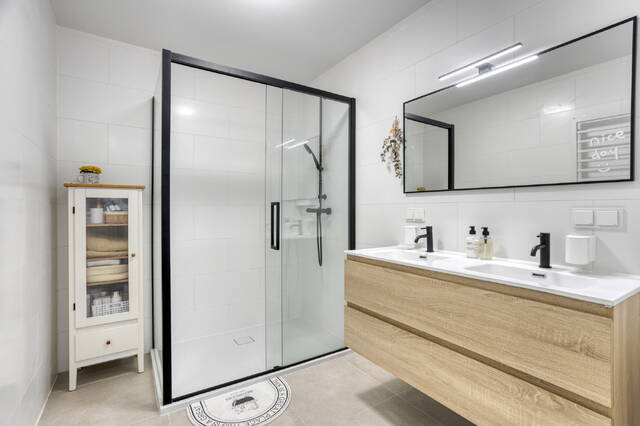 Three well-sized bedrooms, each with its own air conditioning unit. The bathroom was fully renovated in 2022 and includes a walk-in shower, double sink with storage, mirror cabinet and underfloor heating. There is also a separate toilet(2022).