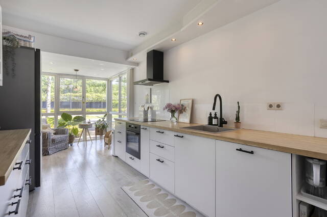 U komt binnen in een royale hal met een toilet. De woonkamer is door de uitbouw aan de achterzijde extra diep en ruim, ideaal voor een grote zithoek of een lange eettafel. De open keuken (vernieuwd in 2023) is modern, stijlvol en voorzien van alle inbouwapparatuur. De grote raampartijen aan voor- en achterzijde zorgen voor veel licht.