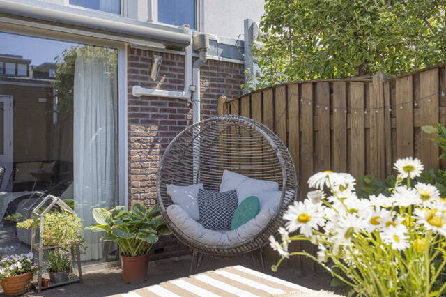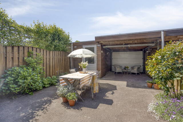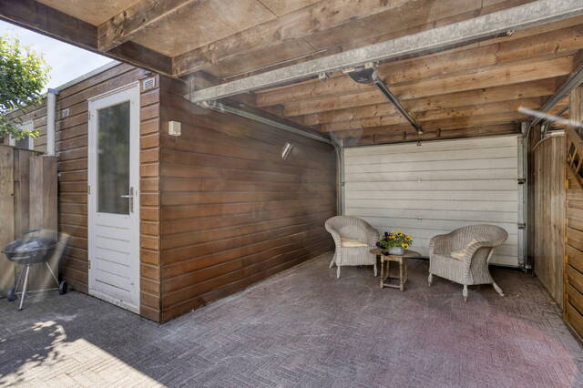 De achtertuin is onderhoudsvriendelijk aangelegd en geeft toegang tot een vrijstaande houten berging. Aan de achterzijde bevindt zich een elektrisch bedienbare garagedeur met een overdekte carport – ideaal voor het veilig en droog parkeren van een auto, motor of zelfs een kleine boot.