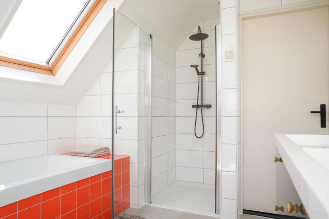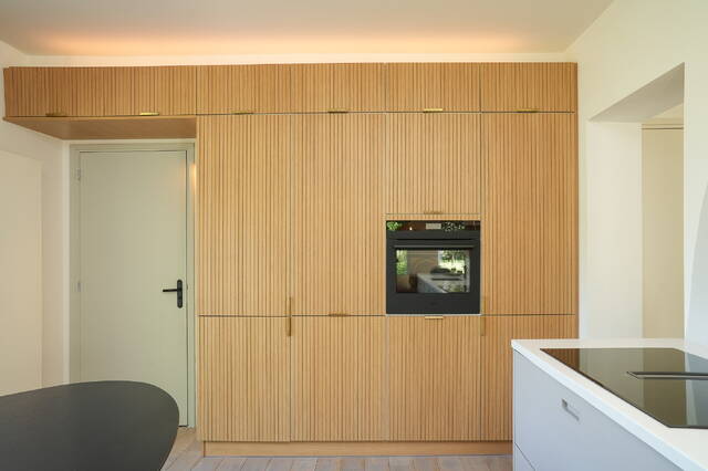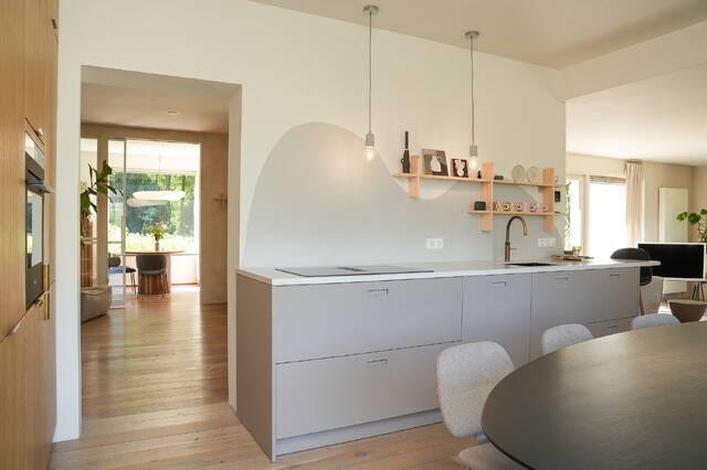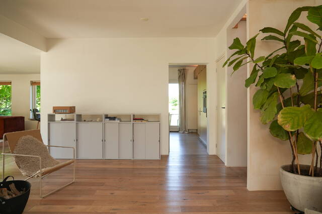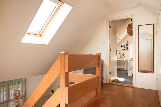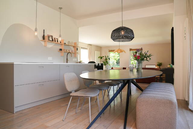 De hoofdwoning is modern afgewerkt met natuurlijke materialen, warme tinten en houten vloeren. De open keuken is een echte blikvanger, uitgerust met hoogwaardige inbouwapparatuur, een stoomoven, inductiekookplaat met geïntegreerde afzuiging, een Quooker en een gun metal spoelbak. De grote eiken wandkasten bieden volop opbergruimte en de keuken loopt direct over in de lichte woonkamer.