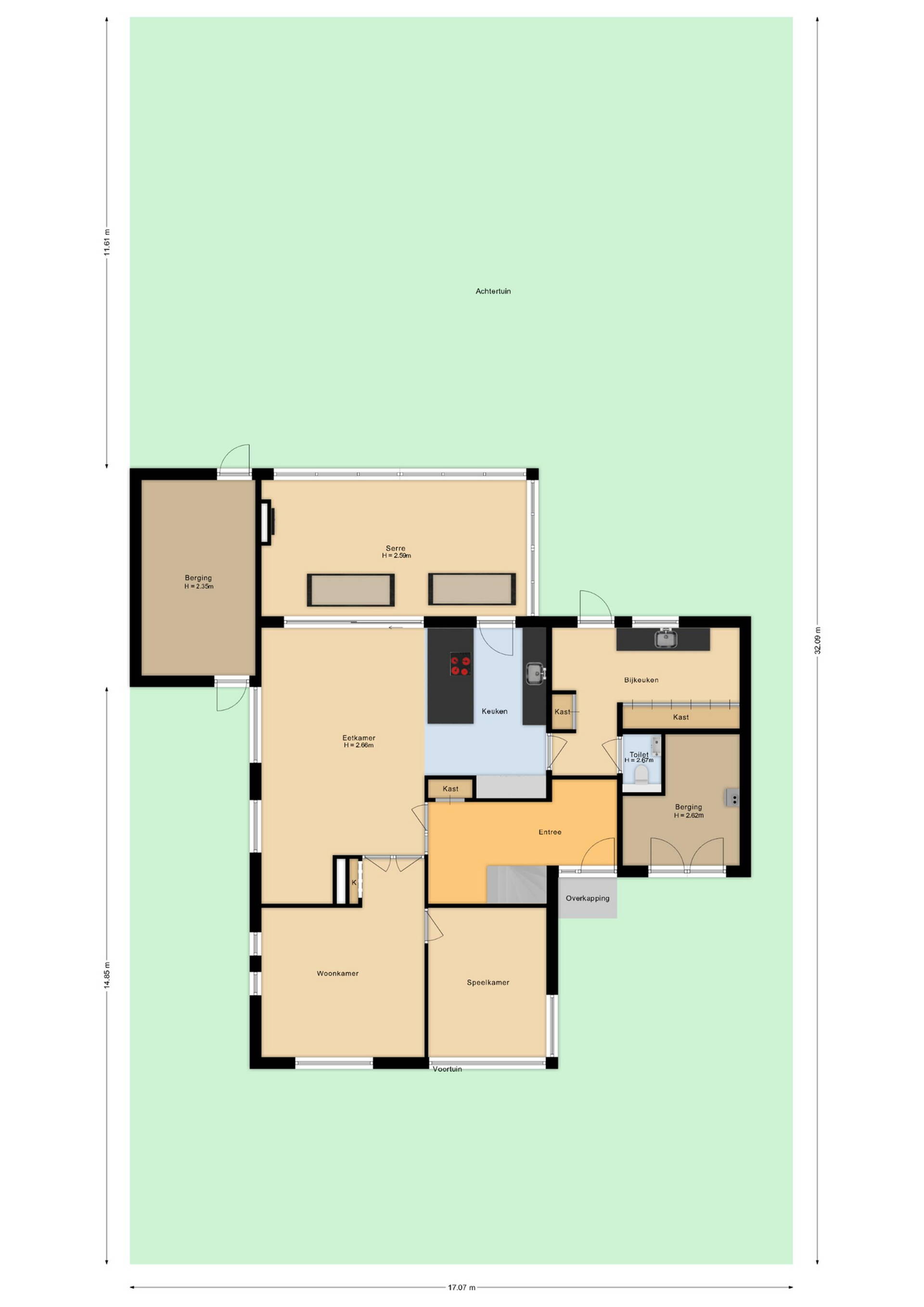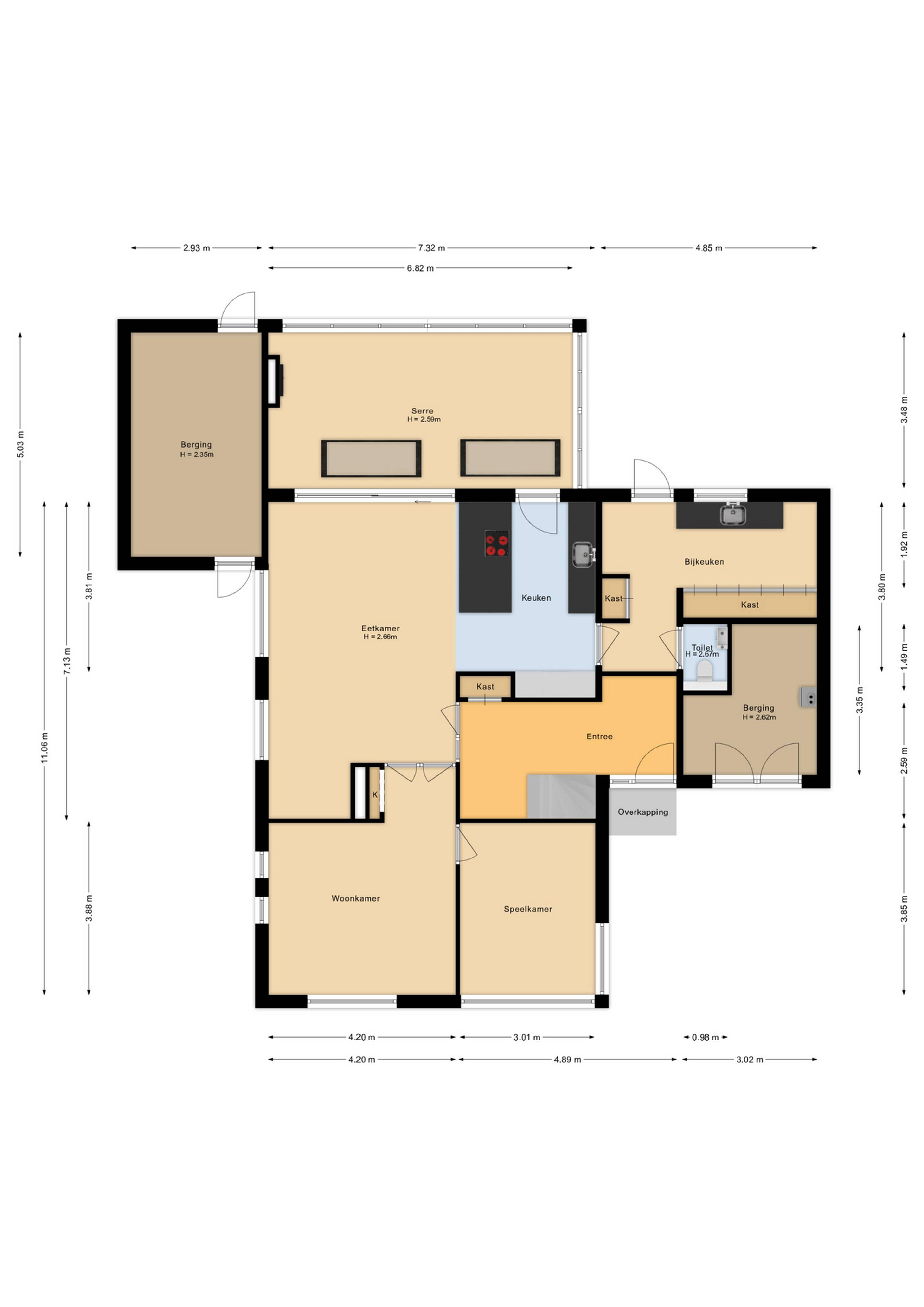 Je komt binnen in een ruime hal, hier bevindt zich de meterkast en de trapopgang naar de eerste verdieping. De ruime woonkamer heeft een weldadige lichtinval en toegang tot de speelkamer. De keuken (2023) is voorzien van een kookeiland met ontbijtbar, inductiekookplaat met geïntegreerde afzuiging, vaatwasser, combi-magnetron, stoomoven, enkele spoelbak met Quooker kraan (kokend en bruiswater) en inbouw koelkast. De keuken geeft ook toegang aan de bijkeuken voorzien van wasmachine kast, vriezer, aanrecht met dubbele spoelbak met kraan en een toilet met hangend closet en fonteintje. Aan de achterzijde bevindt zich een ruime serre met open haard.