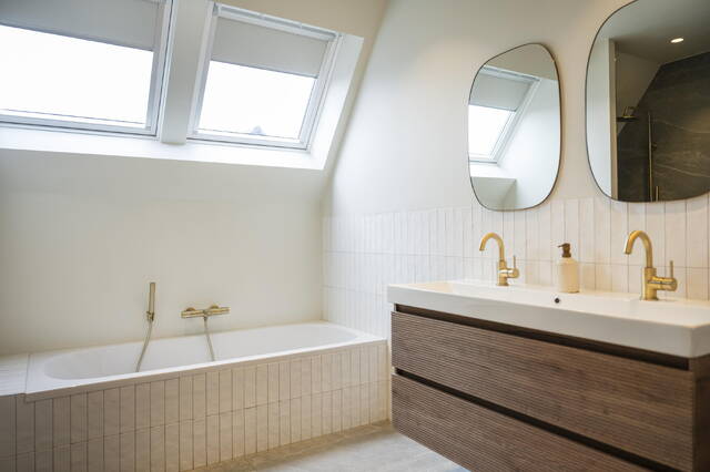 Op de eerste verdieping vinden we een viertal kamers welke allen zijn voorzien van een praktische inbouwkast, tevens biedt een van de slaapkamer ook toegang tot de stookruimte. De badkamer (2023) is voorzien van een hangend closet, dubbel wastafelmeubel, ligbad en inloopdouche met hand- en regendouche.