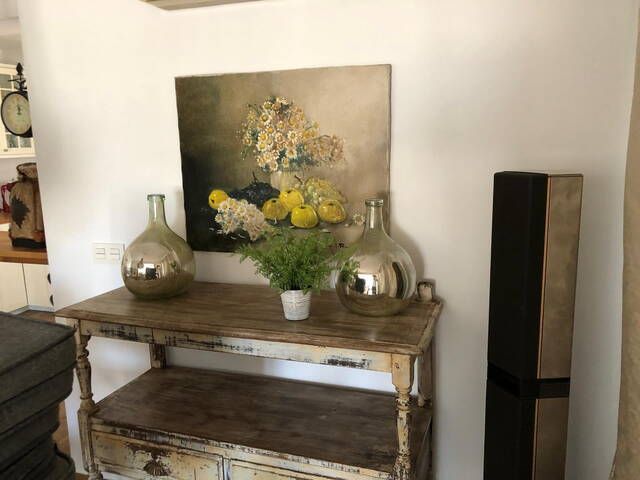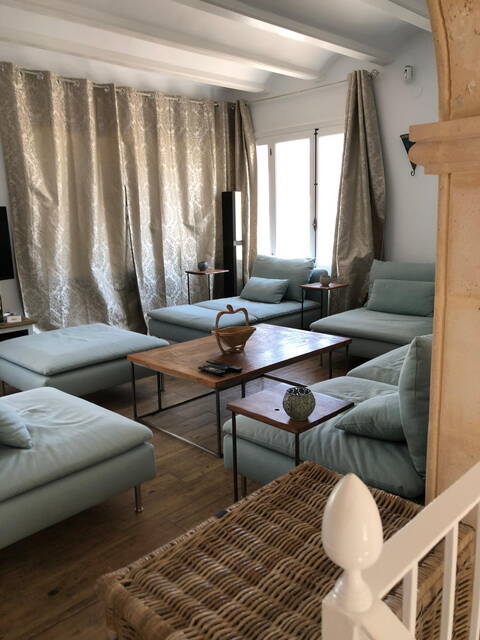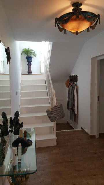 Via een aparte ingang bij de parkeerplaats betreedt u de woning. In de hal bevindt zich een gastentoilet en een elegante split-level trap die leidt naar zowel de bovenste woonverdieping als de lagergelegen slaapvertrekken. Boven vindt u de lichte, ruime woonkamer met een volledig uitgeruste open keuken. Deze gezellige leefruimte komt uit op een deels overdekt terras, met uitzicht op het weelderige zwembad, de groene omgeving en zelfs een glimp van de Middellandse Zee. Via een buitentrap bereikt u ook direct het zwembadterras.