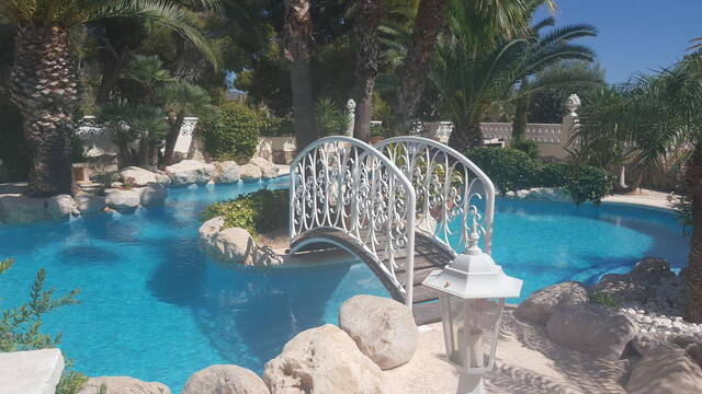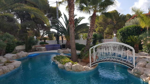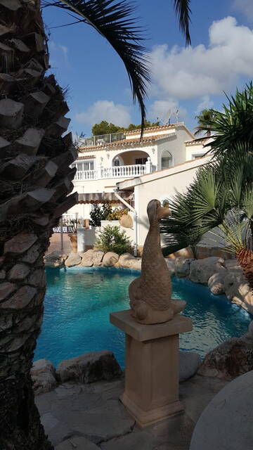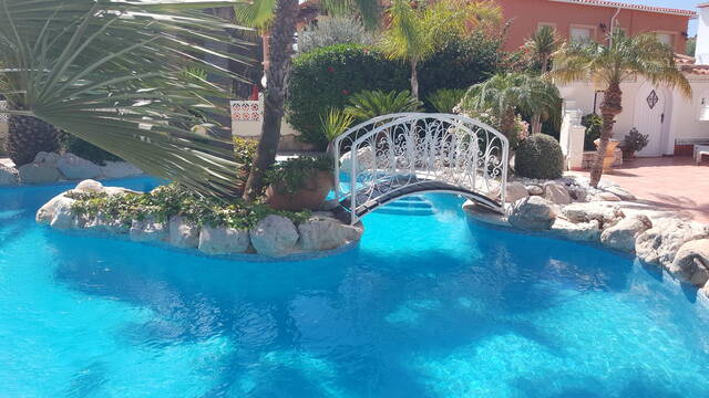 Bij aankomst wordt u verwelkomd door een elektrische poort die toegang geeft tot een ruime oprit met parkeergelegenheid voor twee auto’s. Direct valt het oog op het indrukwekkende buitenleven: een royaal zonneterras met een luxe buitenkeuken, comfortabele loungehoek en als absoluut pronkstuk een spectaculair zwembad met een eigen eiland omringd door palmbomen. Dit paradijselijke tafereel wordt ’s avonds prachtig verlicht, wat zorgt voor een magische sfeer die deze villa tot een waar juweel maakt.