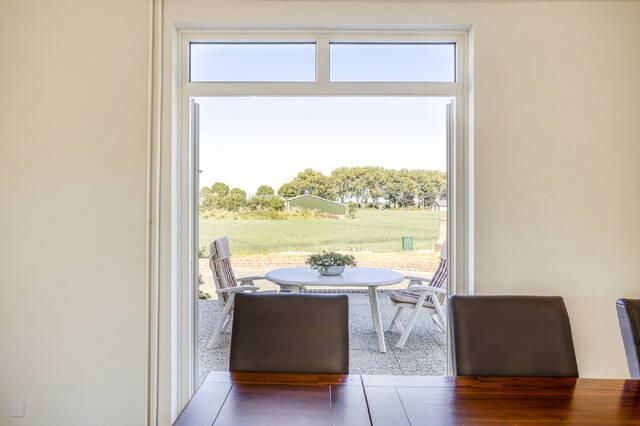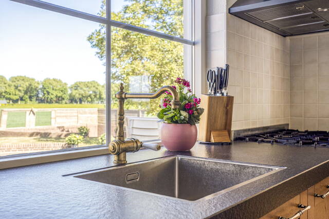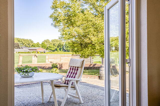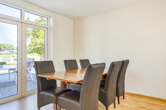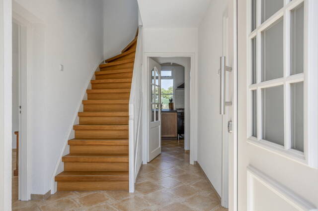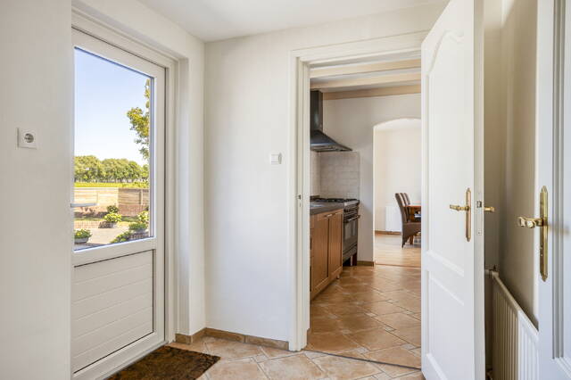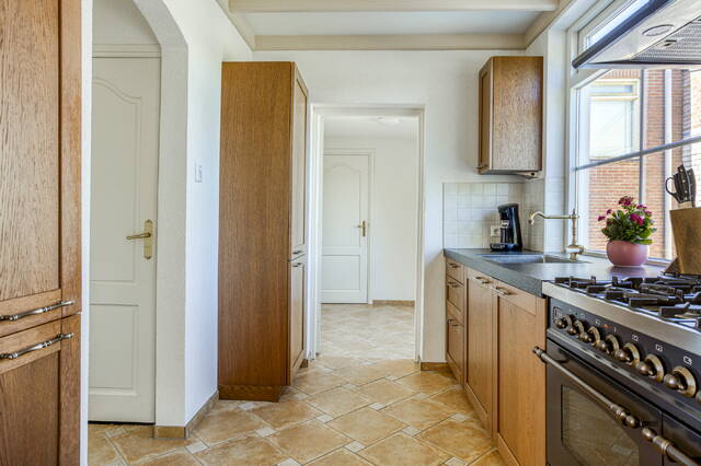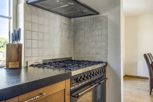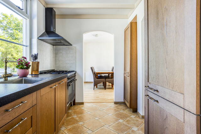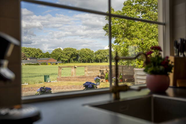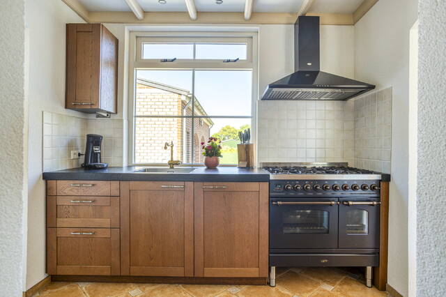 Loop je door naar de woonkamer, dan word je verrast door het gevoel van ruimte en licht. Grote raampartijen zorgen voor een aangename sfeer en een fantastisch uitzicht op het achterliggende groen. Het zitgedeelte is ruim opgezet, en de eethoek grenst aan openslaande deuren naar het terras – perfect voor een kop koffie in de ochtendzon of een diner bij zonsondergang. De keuken sluit mooi aan bij de landelijke uitstraling van het huis en is voorzien van een robuust Boretti-fornuis met dubbele oven, een afzuigkap en een koel-/vriescombinatie. De warme houttinten van het keukenmeubilair geven het geheel een authentieke sfeer. Aansluitend vind je de bijkeuken met toegang tot het toilet, een bergkast met witgoedaansluitingen en de achtertuin.