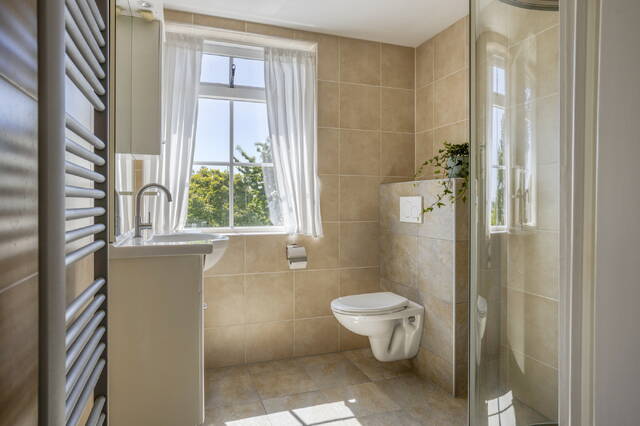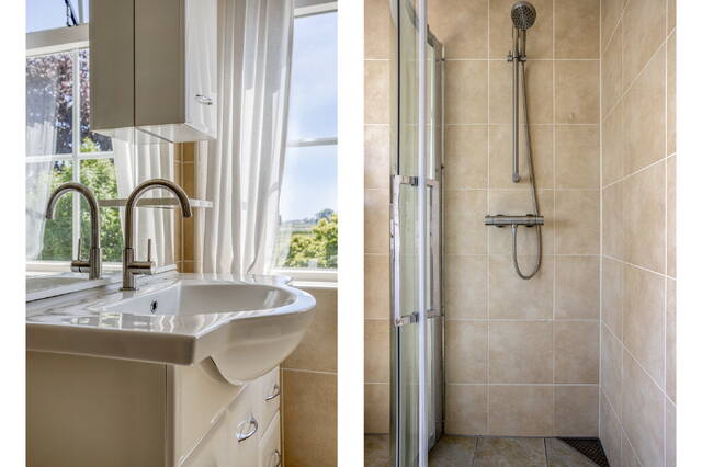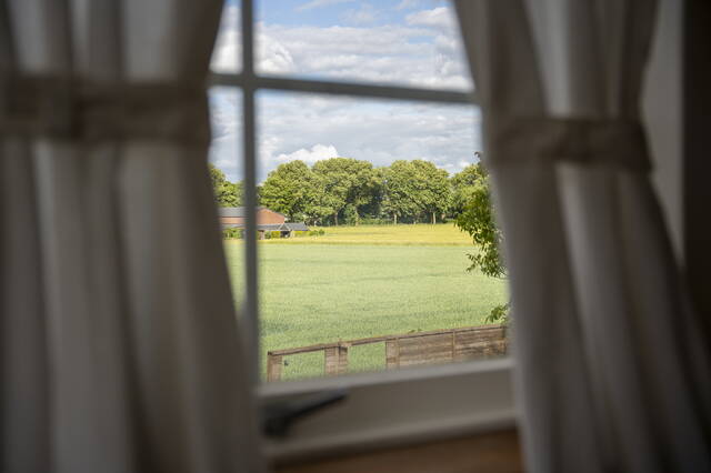 Op de eerste verdieping bevinden zich drie slaapkamers, stuk voor stuk keurig afgewerkt en voorzien van raampartijen met landelijke uitzichten. De badkamer is netjes ingericht met een douchecabine, wastafelmeubel, wandcloset en een groot raam voor natuurlijke lichtinval en ventilatie.