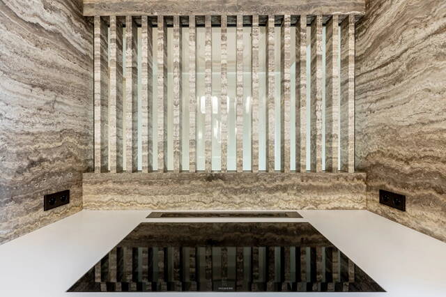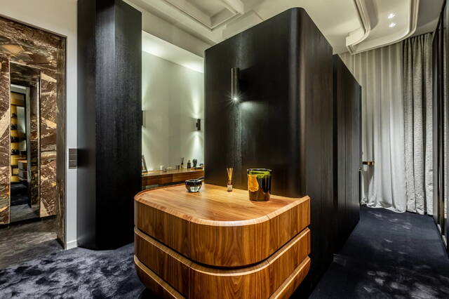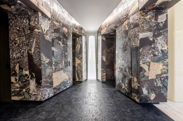 - Entrance hall with burnt oak origami flooring, marble walls, and sculpted staff ceiling