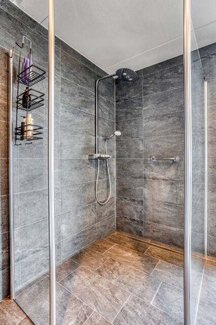 Volwaardige badkamer met douche, wastafel en bergruimte