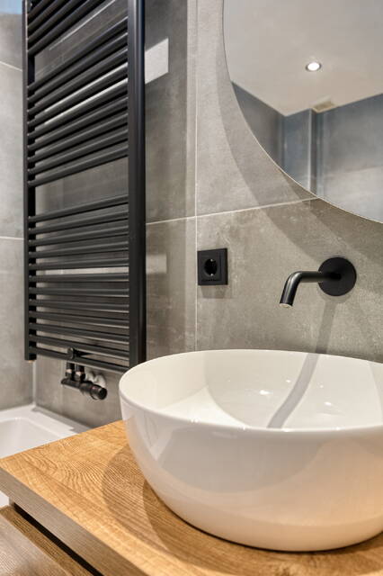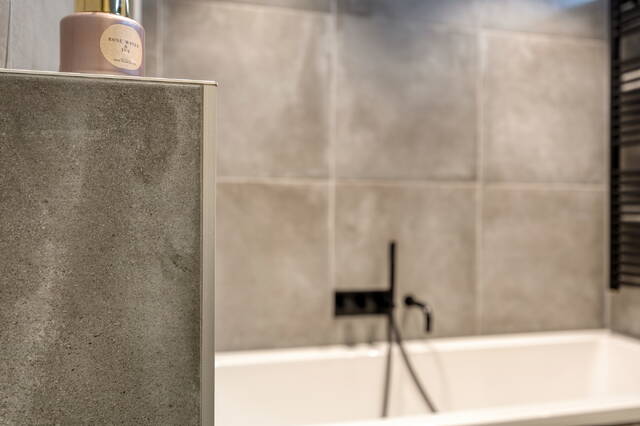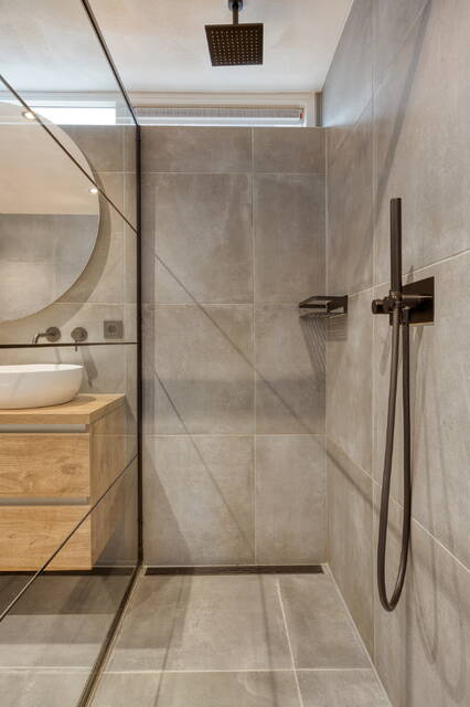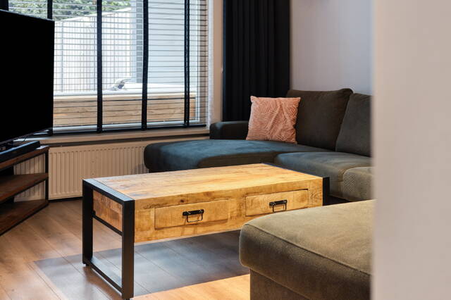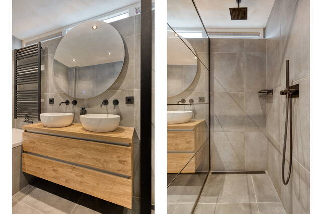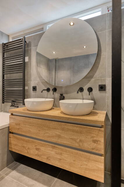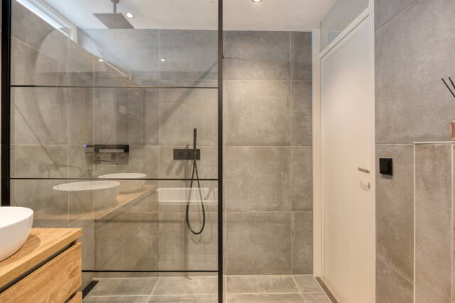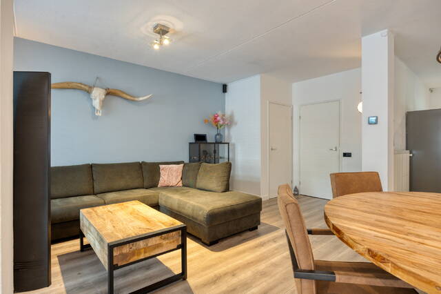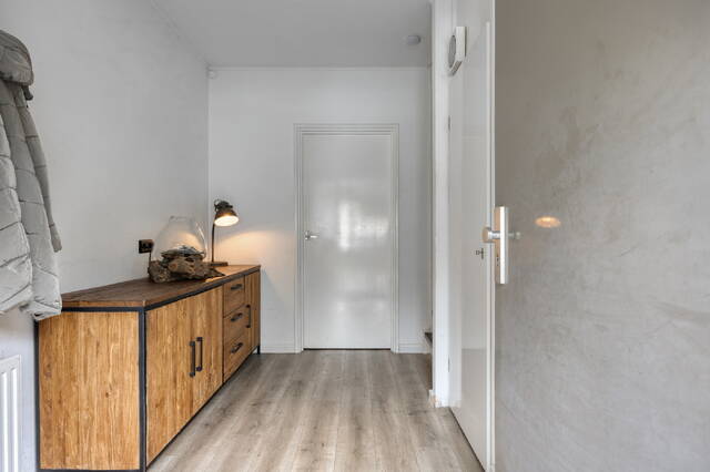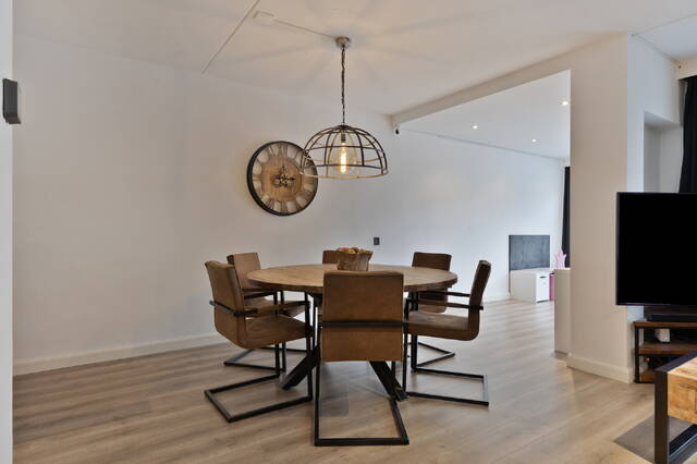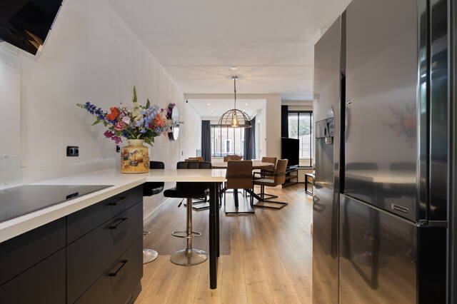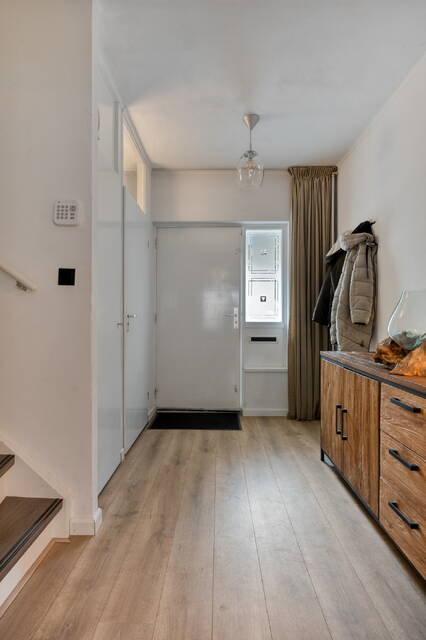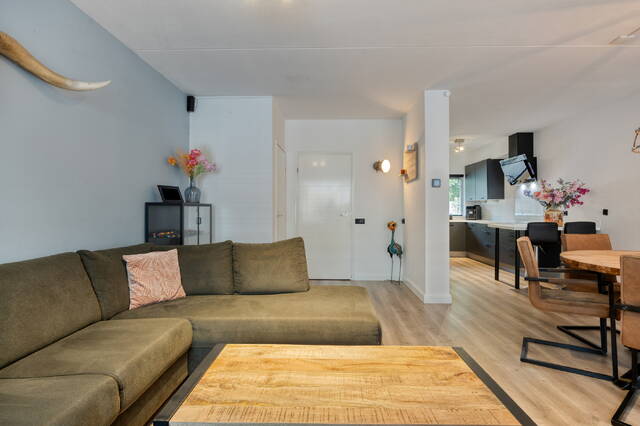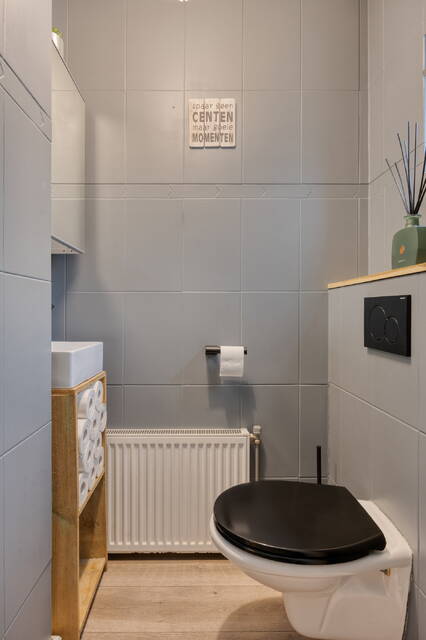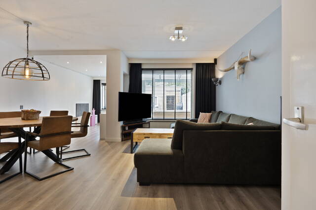 Entering through the spacious hallway with toilet, you step into the bright living room with open kitchen. Thanks to the rear extension, a generous living area has been created where light, tranquillity and comfort come together. The sleek finish, modern flooring and large windows create a pleasant, homely atmosphere. The open kitchen is both practical and stylish, equipped with built-in appliances such as an induction hob, dishwasher, oven, microwave and extractor hood. A place where cooking and being together come naturally.