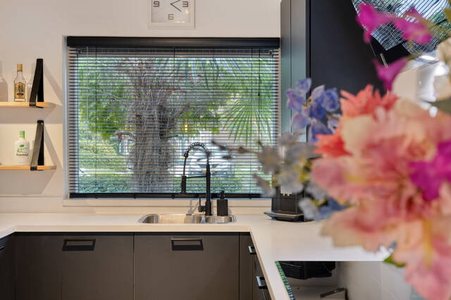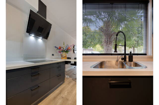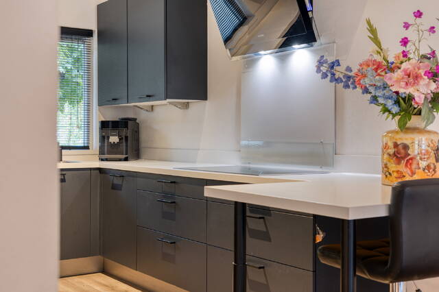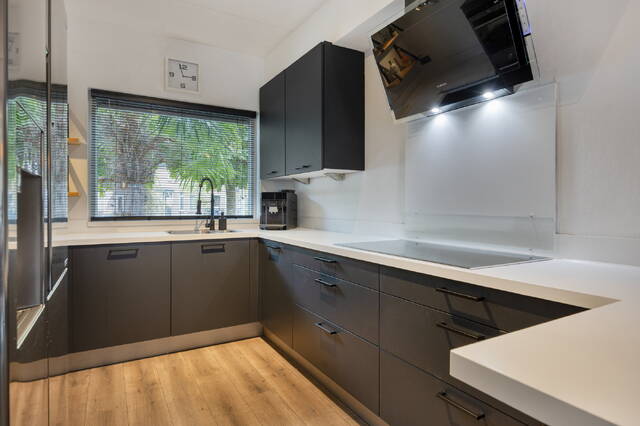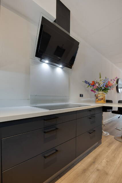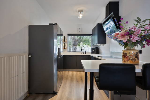 Binnenkomend via de ruime hal met toilet stap je de lichte woonkamer met open keuken binnen. Door de uitbouw aan de achterzijde is er een royale leefruimte ontstaan waar licht, rust en comfort samenkomen. De strakke afwerking, moderne vloer en grote ramen zorgen voor een prettige, huiselijke sfeer. De open keuken is praktisch en stijlvol, voorzien van inbouwapparatuur zoals een inductiekookplaat, vaatwasser, oven, magnetron en afzuigkap. Een plek waar koken en samenzijn vanzelf gaan.