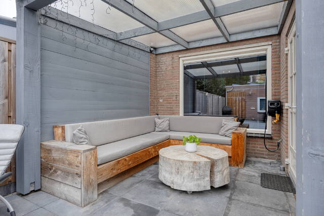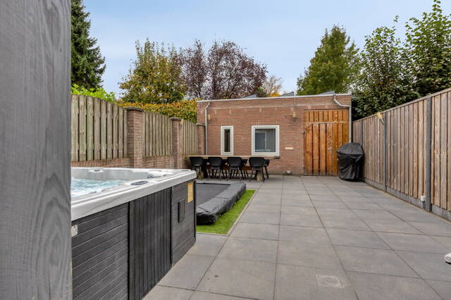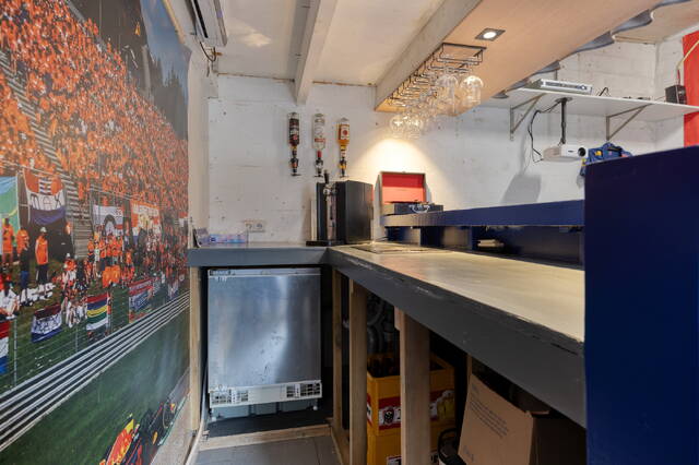De achtertuin is strak en onderhoudsvriendelijk aangelegd. Onder de overkapping kun je het hele jaar door genieten van het buitenleven, van lange zomeravonden tot knusse herfstborrels. Achterin de tuin wacht iets bijzonders: een stenen schuur die is omgetoverd tot mancave met eigen bar, elektra en wateraansluiting. De ideale plek om te ontspannen, een potje te darten of met vrienden de Formule 1 te kijken. De bar is eventueel ter overname.