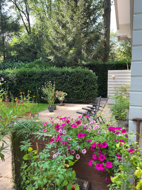 • Grote, volgroeide tuin – Zuidwest georiënteerde tuin met diverse terrassen, een kleine vijver, volledige omheining, verlichting en ruime oprit voor 2 auto’s.