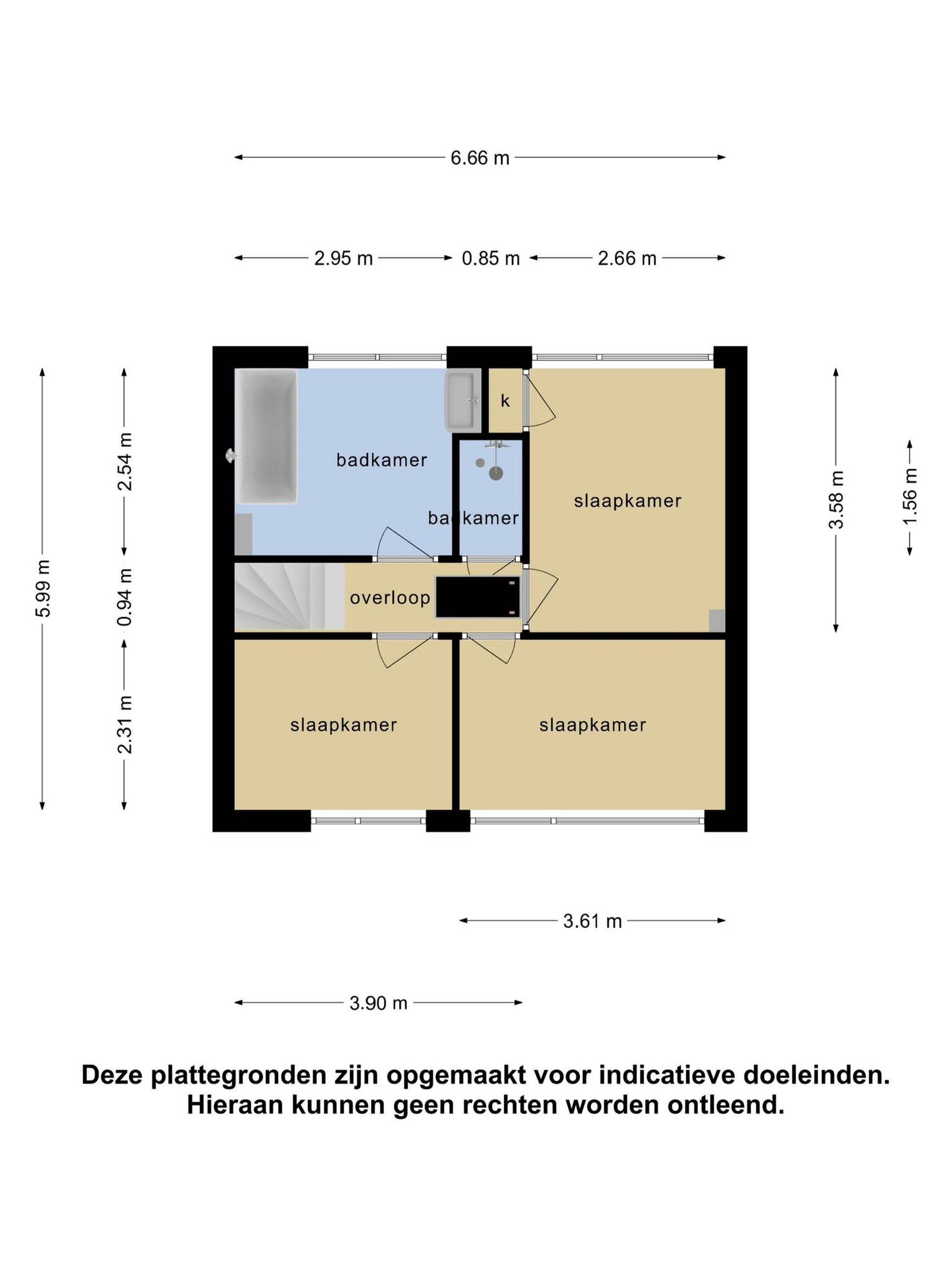 De overloop biedt toegang tot twee badkamers en 3 slaapkamers voorzien van rolluiken. In de eerste badkamer bevindt zich de douche. In de tweede badkamer bevindt zich een ligbad, kast en wastafel met meubel.
