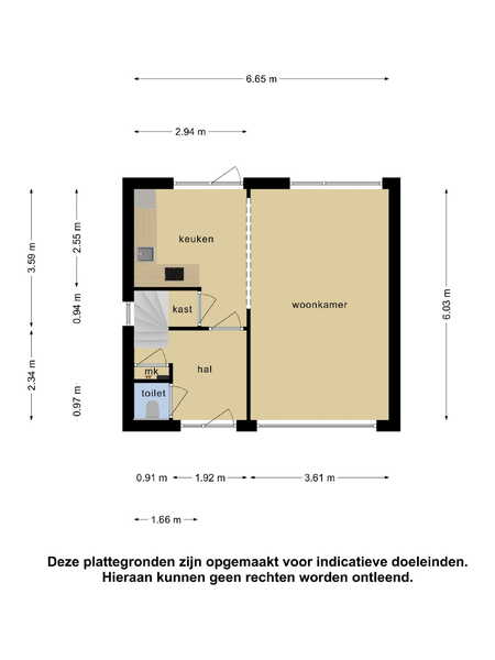 Achter de voordeur schuilt een hal met toegang tot een modern toilet, de meterkast, garderobe, woonkamer en vaste trapopgang naar de eerste verdieping.