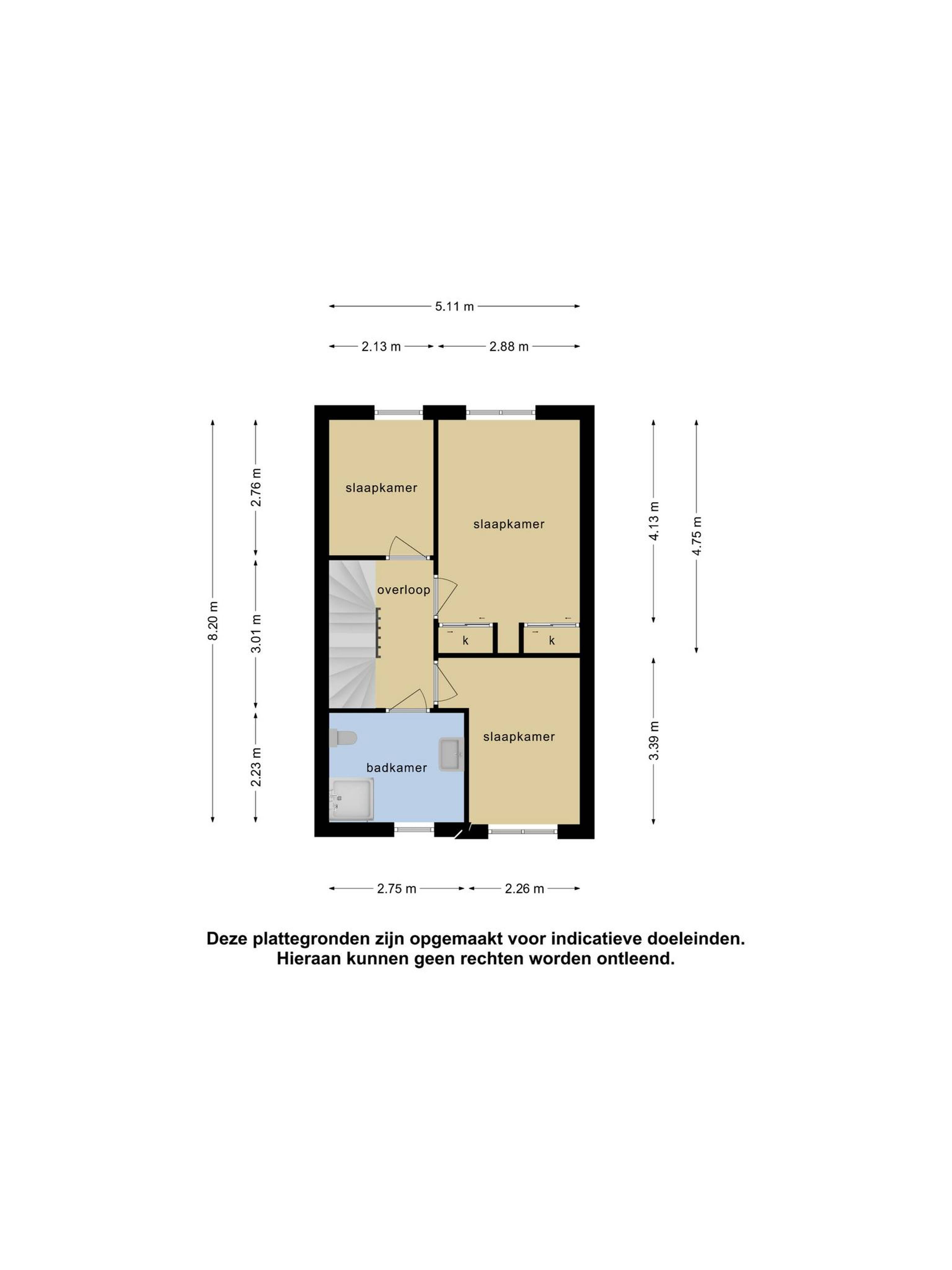 Middels de trapopgang vanuit de entreehal komt u op de overloop terecht. Deze overloop geeft toegang tot 3 slaapkamers en de badkamer. Twee van deze slaapkamers bevinden zich aan de achterzijde van de woning, de derde aan de straatzijde. Alle slaapkamers zijn voorzien van laminaat en stukwerk.