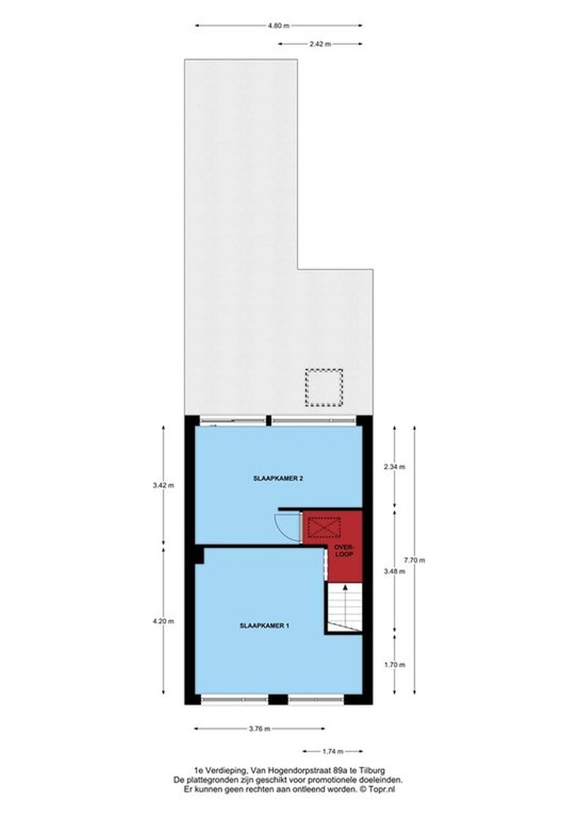Via de overloop heeft u toegang tot twee grote slaapkamers, beiden met een nette laminaatvloer, grote raampartijen en radiatoren. Dit vertrek bestond voorheen uit twee separate kamers en kan gemakkelijk worden gesplitst. Via een vlizotrap op de overloop heeft u toegang tot de bergzolder.