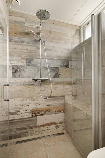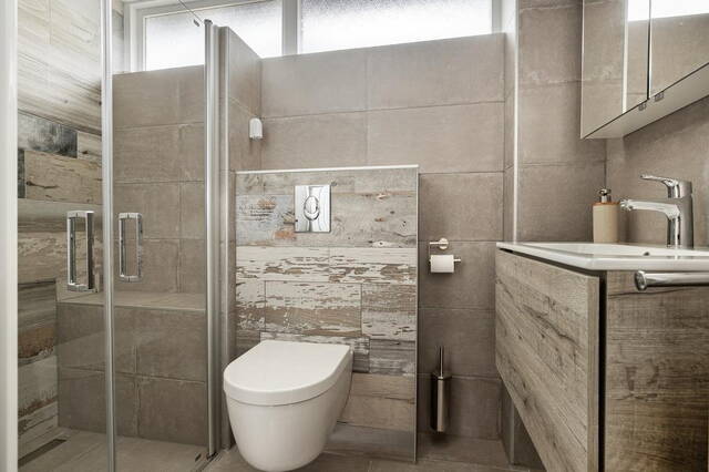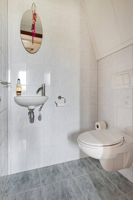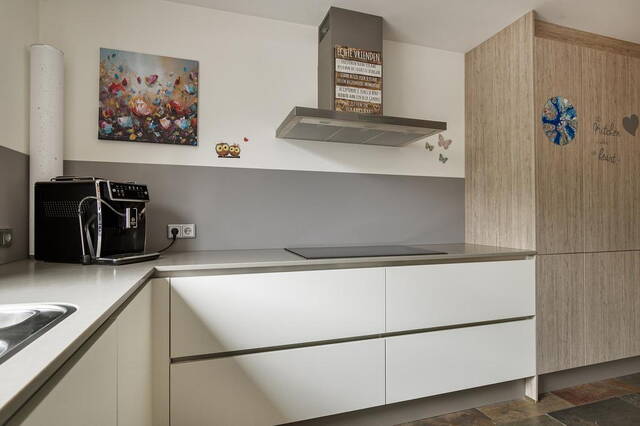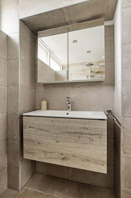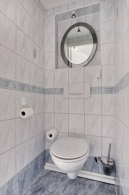 Op de eerste verdieping vind je drie comfortabele slaapkamers, allemaal voorzien van vaste kasten voor optimale opbergruimte. De moderne badkamer is betegeld tot aan het plafond en uitgerust met een inloopdouche, broyeurtoilet, wastafel met meubel en spiegelkast.