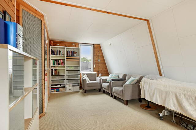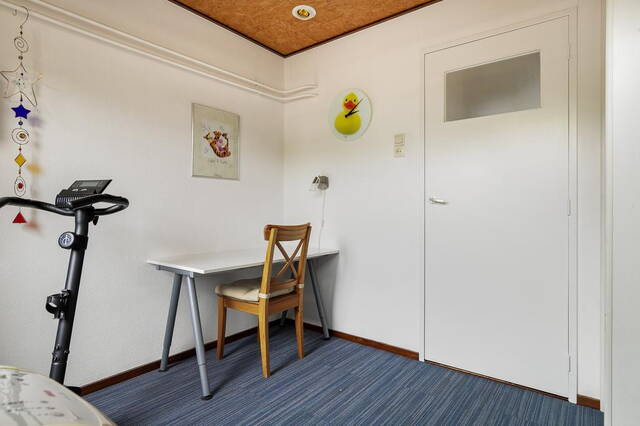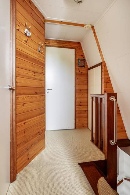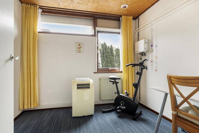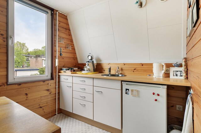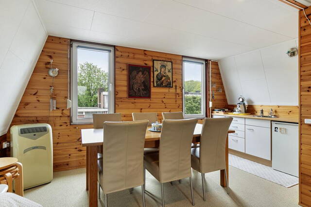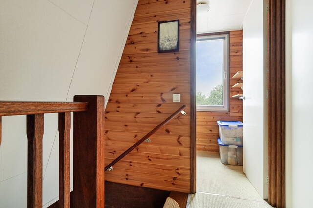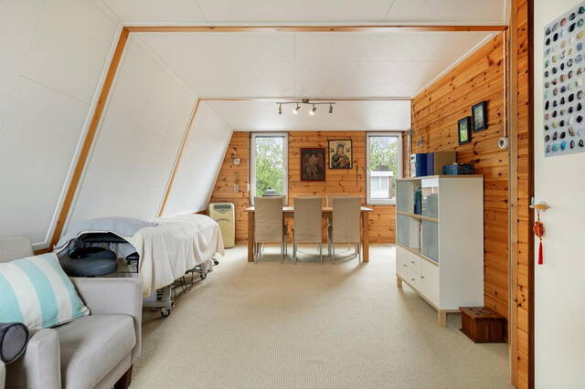 Een vaste trap leidt naar de zolderverdieping, waar zich een overloop bevindt met toegang tot een extra woonkamer met eetgedeelte en een apart toilet. De eetkamer beschikt over een recht keukenblok met wateraansluiting en ruimte voor een koelkast, waardoor deze ruimte veelzijdig te gebruiken is.