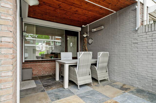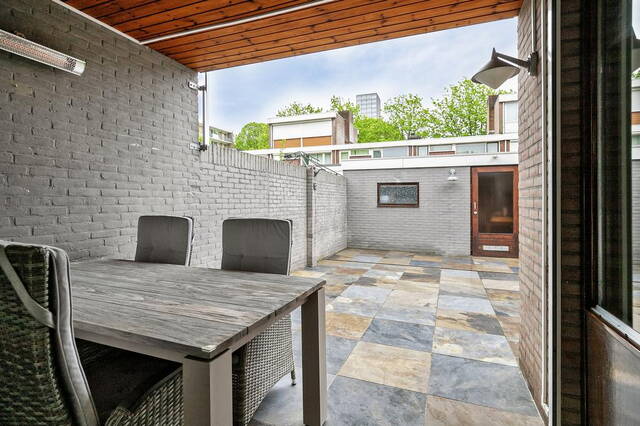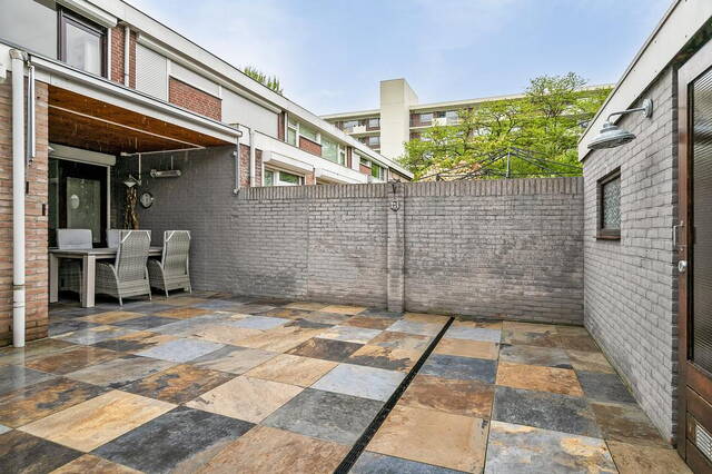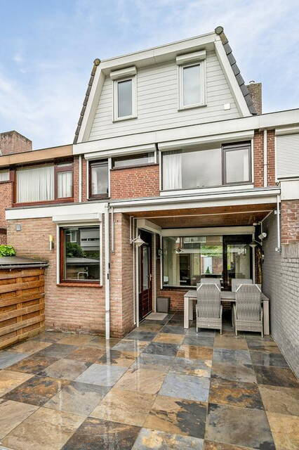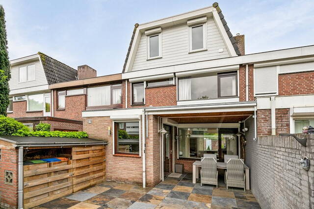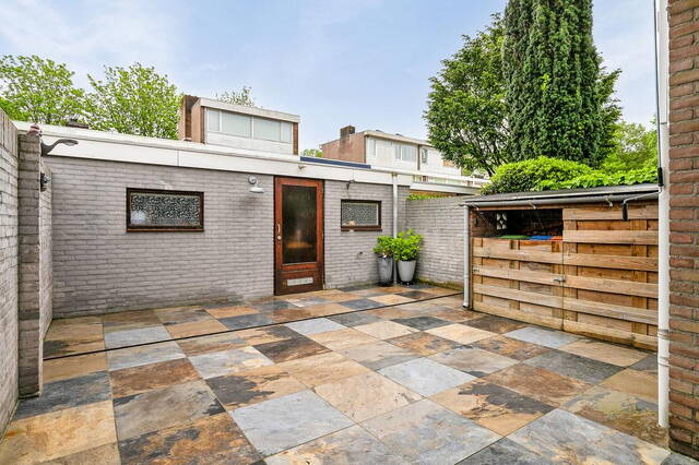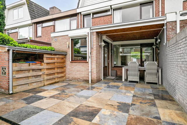Via de keuken stap je zo de achtertuin in, die volledig betegeld is en voorzien van een stenen berging. Deze berging biedt niet alleen extra opslagruimte, maar ook een handige achterom.