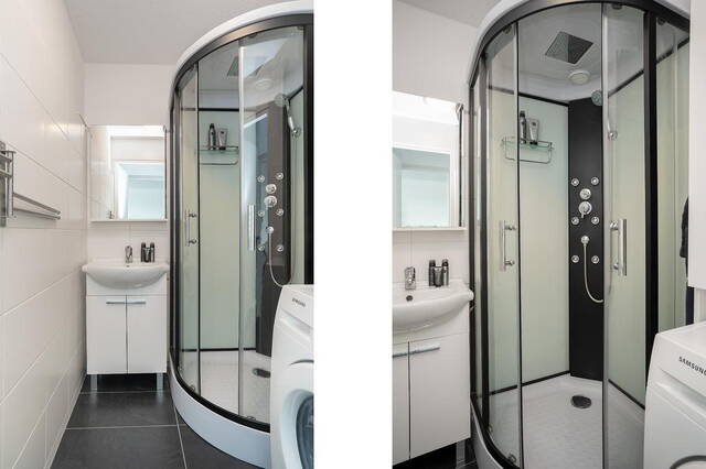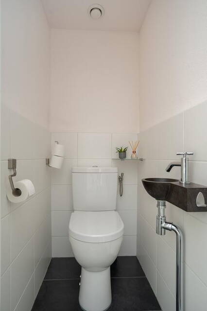 De badkamer uitgerust met een luxe douchecabine, wastafel met meubel en een wasmachineaansluiting. De ruimte is keurig betegeld. Het separate toilet beschikt over een fonteintje en een standaard closet.