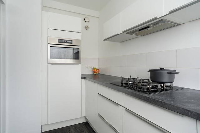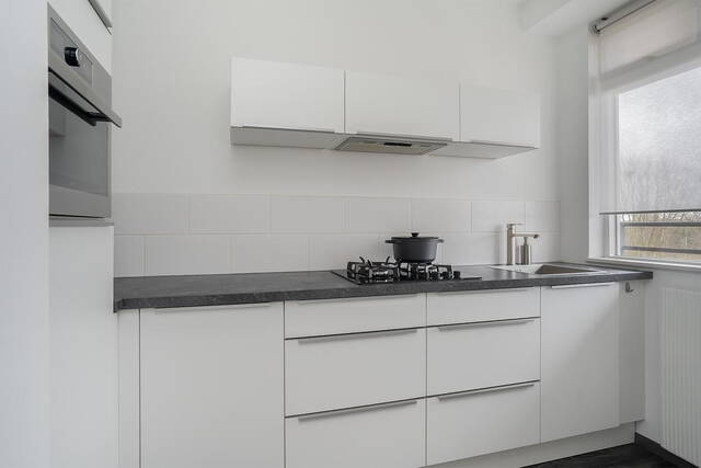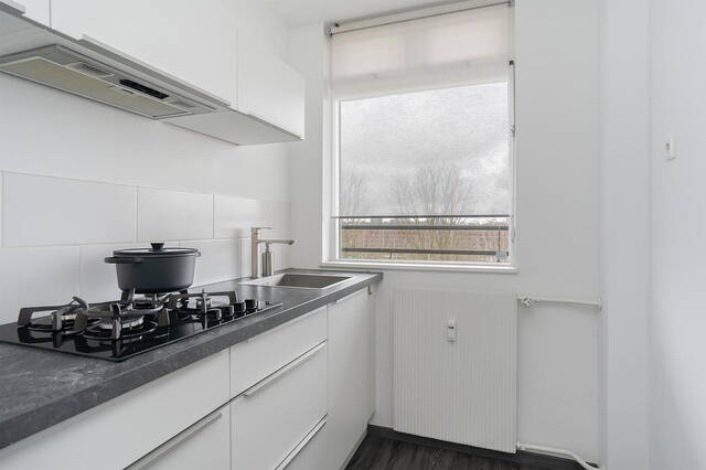 De gesloten keuken is modern uitgevoerd en voorzien van diverse inbouwapparatuur, waaronder een combimagnetron, 4-pits gaskookplaat, koelkast en een vaatwasser. Vanuit de keuken kijkt u uit over het groene Spoorpark.