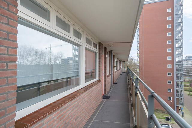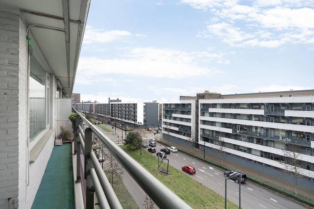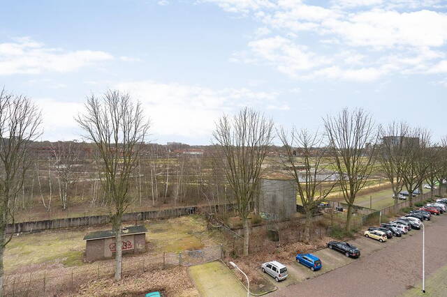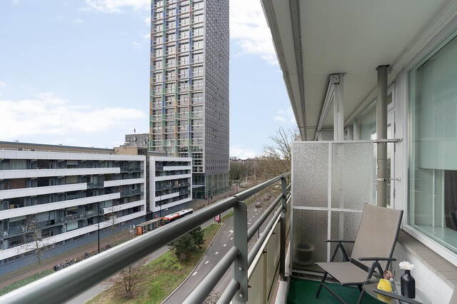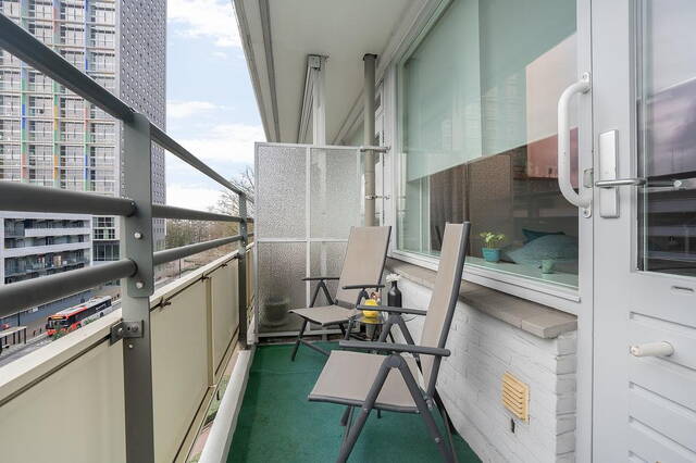 Het balkon is gelegen op het zuiden en biedt uitzicht op onder meer de Westpoint-toren en de Spoorlaan. Een heerlijke plek om van de zon te genieten!