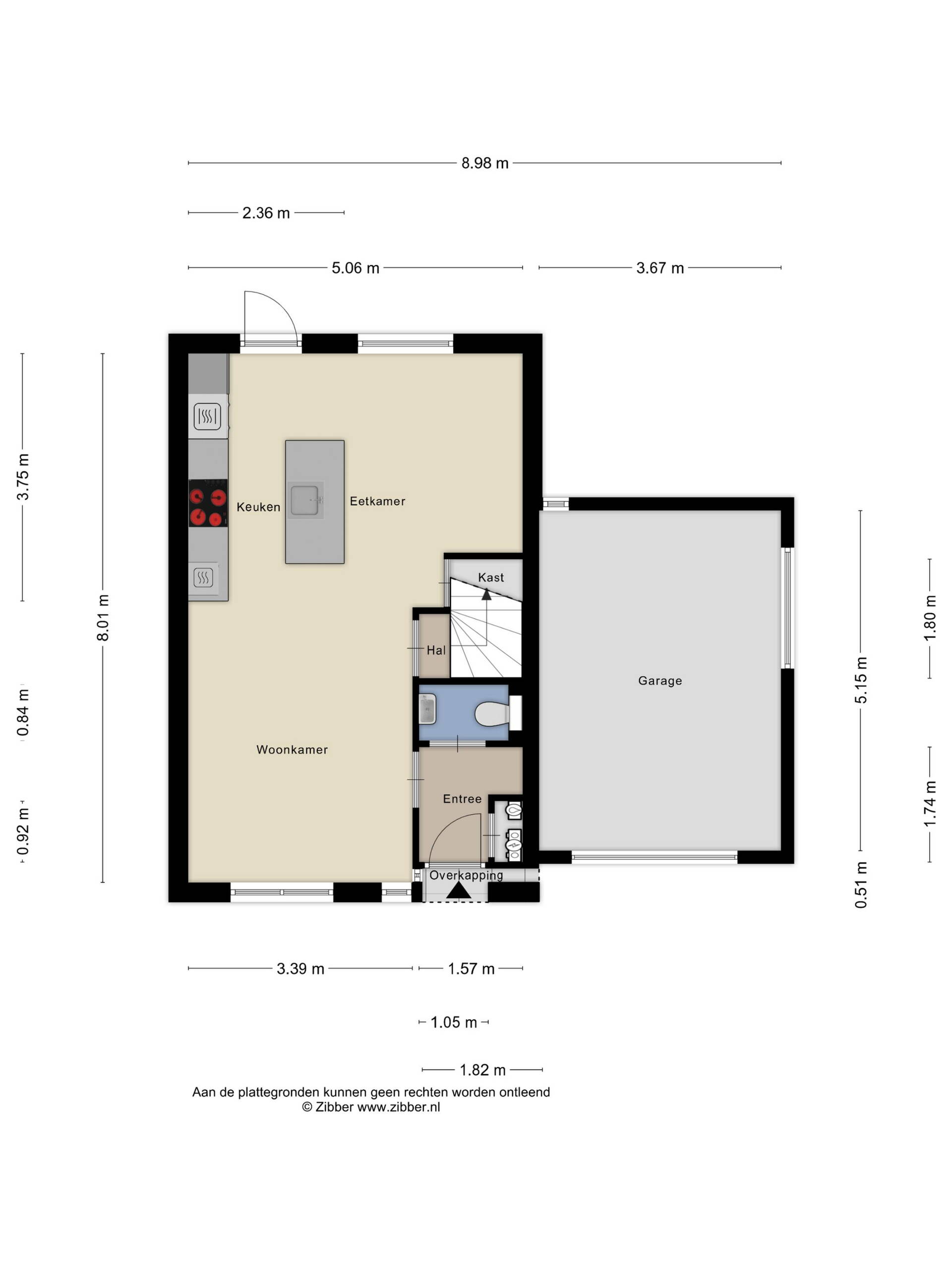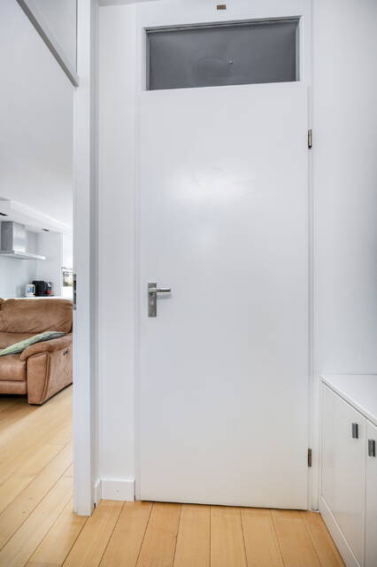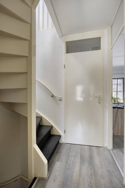 Via de woonkamer leidt een klein halletje naar de trapopgang. Onder de trap bevindt zich een afgesloten trapkast – handig voor extra opbergruimte.