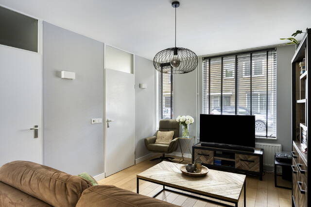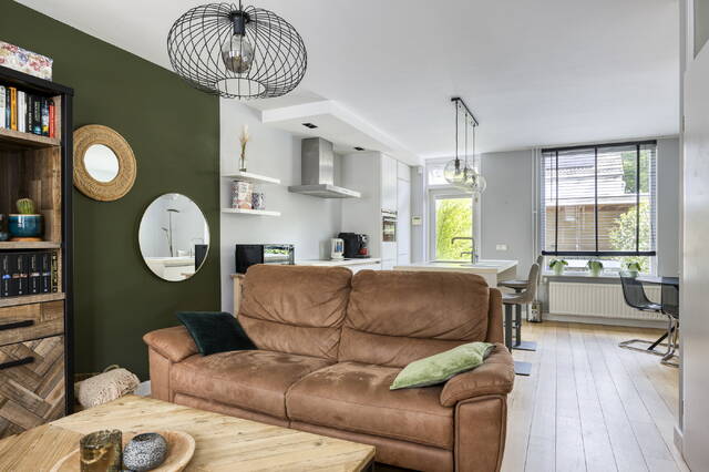 De woonkamer is opvallend licht dankzij de grote raampartijen en de gunstige hoekligging. De wanden zijn strak gestuct en de ruimte voelt modern en sfeervol aan. Er is plek voor een comfortabele zithoek én een gezellige eethoek.