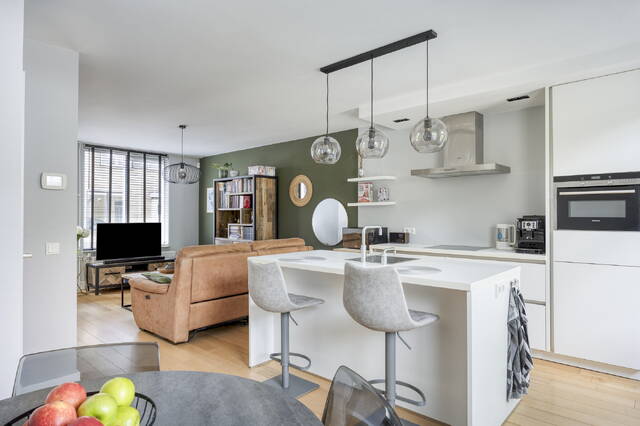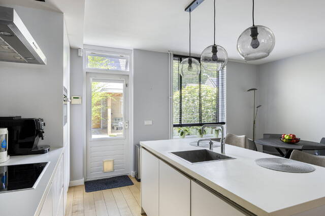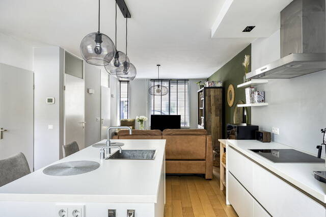 Aan de achterzijde van de woning bevindt zich de open keuken. Deze is uitgevoerd met witte fronten en beschikt over een spoeleiland met zitgedeelte. Uiteraard is de keuken voorzien van de benodigde inbouwapparatuur. Het spoeleiland maakt koken niet alleen praktisch, maar ook gezellig: je blijft altijd in contact met het gezelschap aan tafel of op de bank.