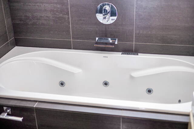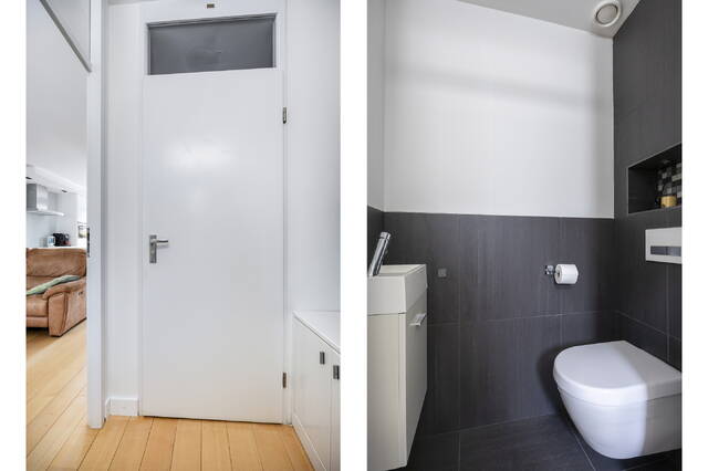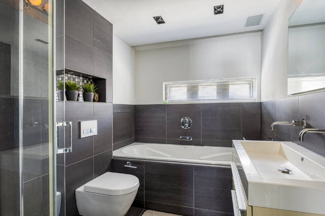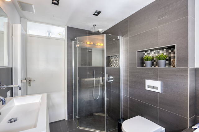 De badkamer is modern en compleet uitgevoerd: je vindt hier een hangtoilet, dubbele wastafel met meubel, een inloopdouche, een ligbad met jets en een designradiator. De combinatie van donker tegelwerk, strakke lijnen en het comfort maken van deze badkamer een fijne plek om tot rust te komen.