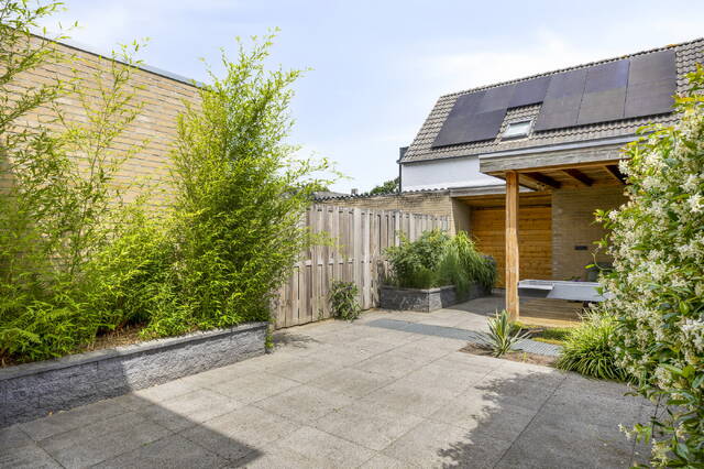 De achtertuin is verzorgd en grotendeels bestraat, met enkele borders voor een groene uitstraling en weinig onderhoud. Achter in de tuin bevinden zich een houten berging en een stenen berging. Hierdoor is er meer dan voldoende ruimte voor het opbergen van fietsen, (tuin)gereedschap, kliko’s of bijvoorbeeld seizoensspullen.