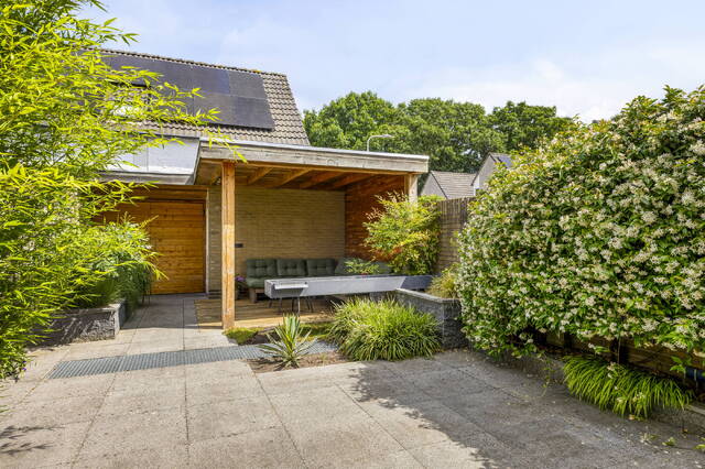 Grenzend aan een van de bergingen ligt een sfeervol overdekt zitgedeelte op houten vlonders. Dit terras onder de overkapping is een heerlijke plek om beschut buiten te zitten – zowel op warme zomerdagen als op regenachtige momenten. Dankzij de hoekligging van de woning geniet je hier van extra privacy.