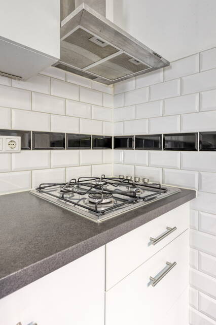 Aansluitend vind je de half-open keuken, voorzien van diverse inbouwapparatuur, waardoor koken hier comfortabel en praktisch is. Denk aan een fornuis, afzuigkap, oven en koel-/vriescombinatie.
