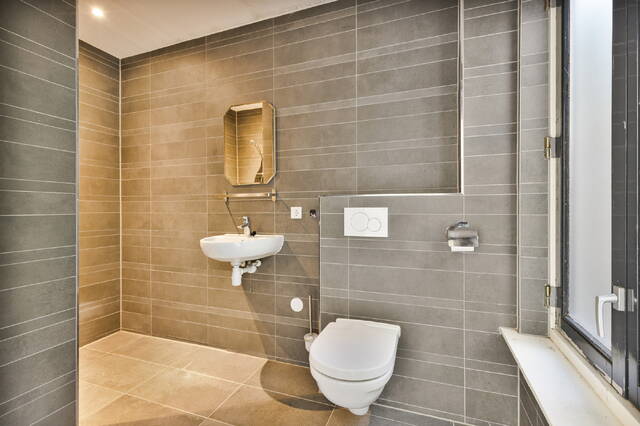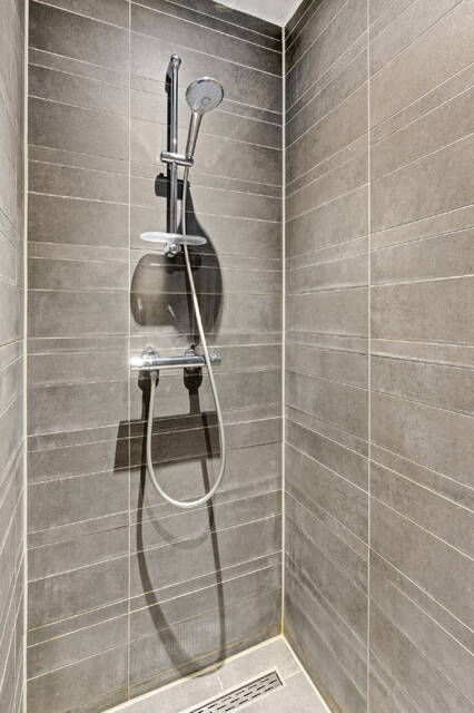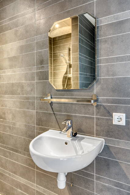 De badkamer is compact maar efficiënt ingedeeld met een inloopdouche, toilet en wastafel.