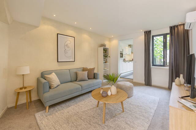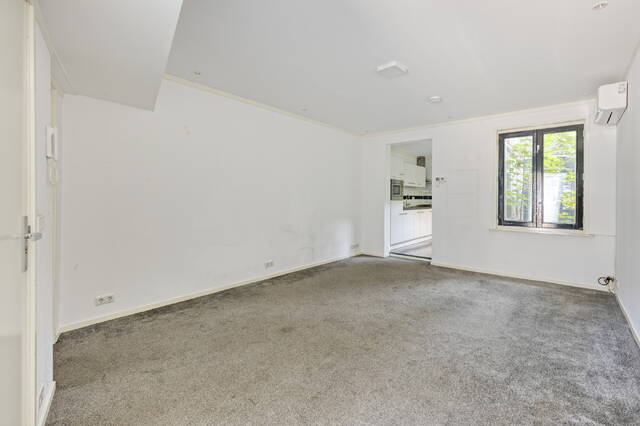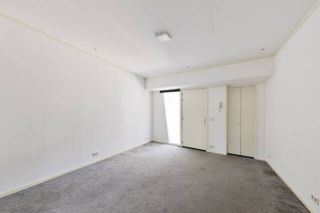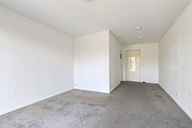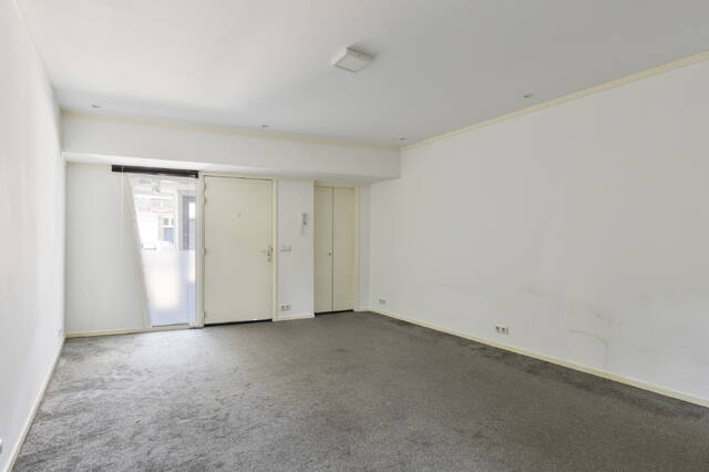 Via de centrale entree op de begane grond bereik je het appartement. Bij binnenkomst stap je direct de woonkamer binnen, voorzien van een ingebouwde trappenkast – ideaal voor extra bergruimte. De woonkamer heeft een prettige sfeer en voelt ruim aan.